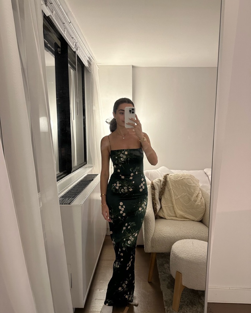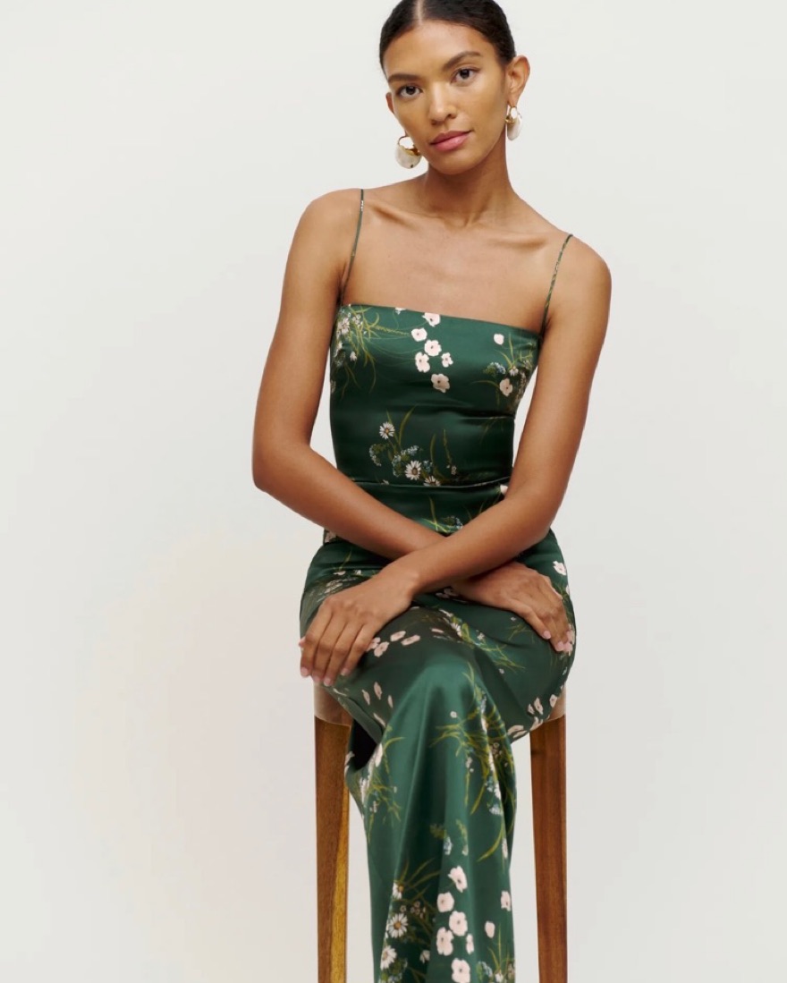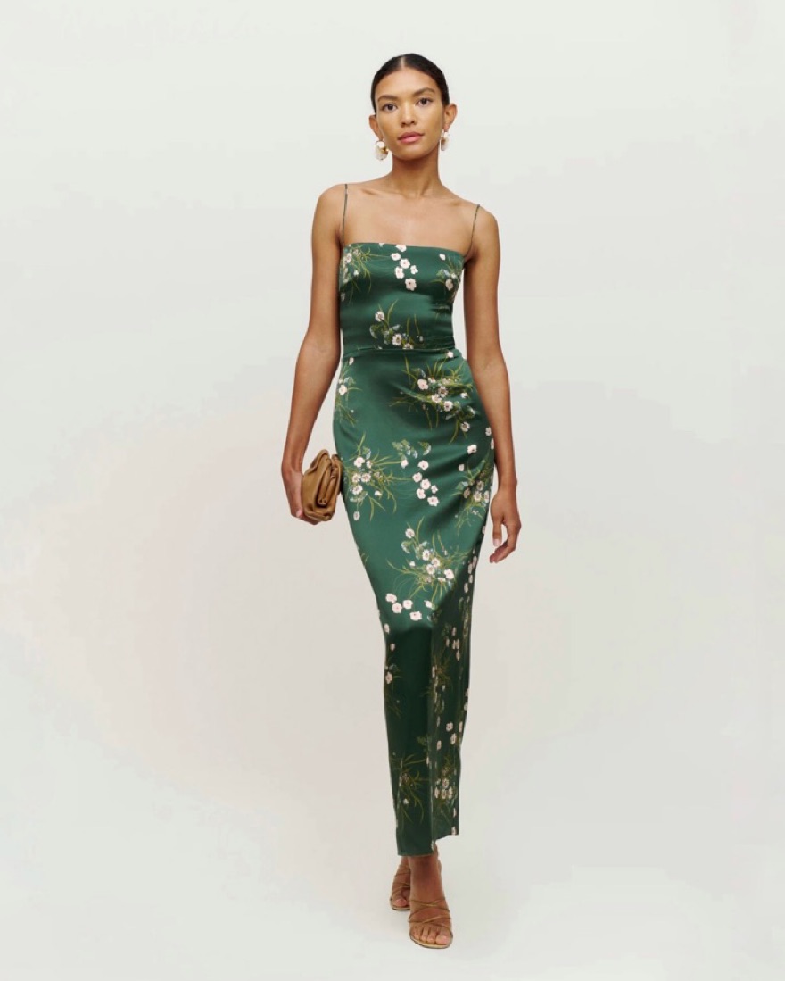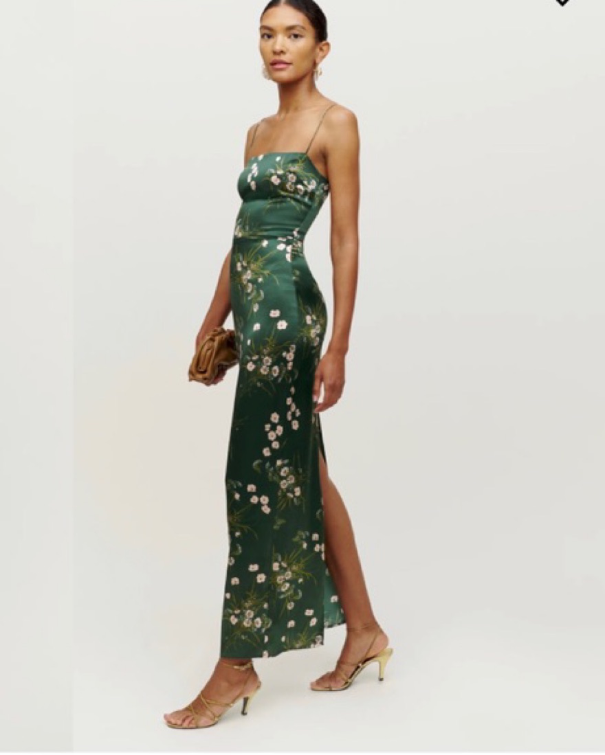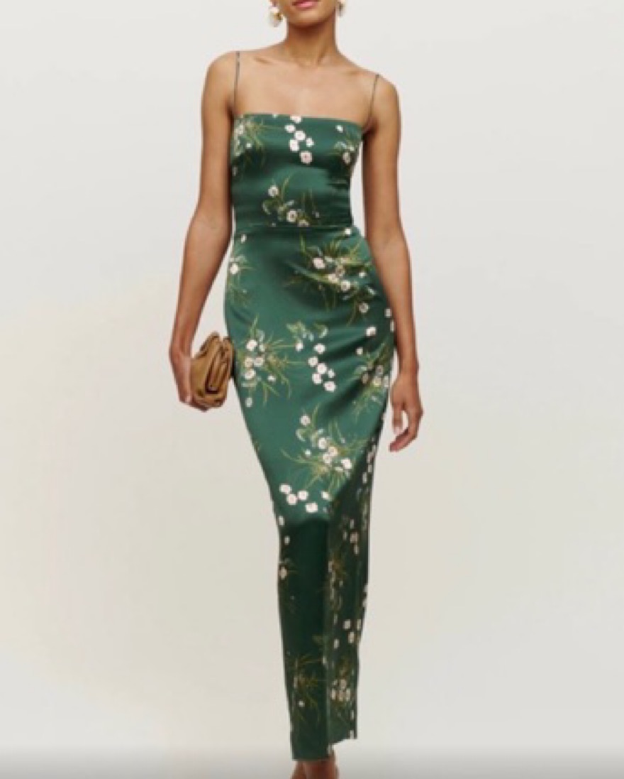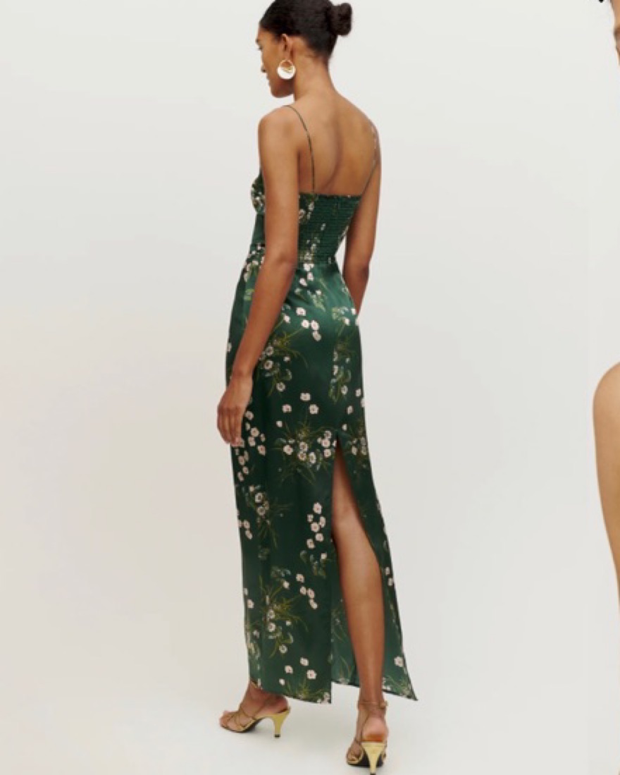 Renting my reformation frankie silk green floral maxi dress in a size 0 perfect wedding guest dress or summer dress