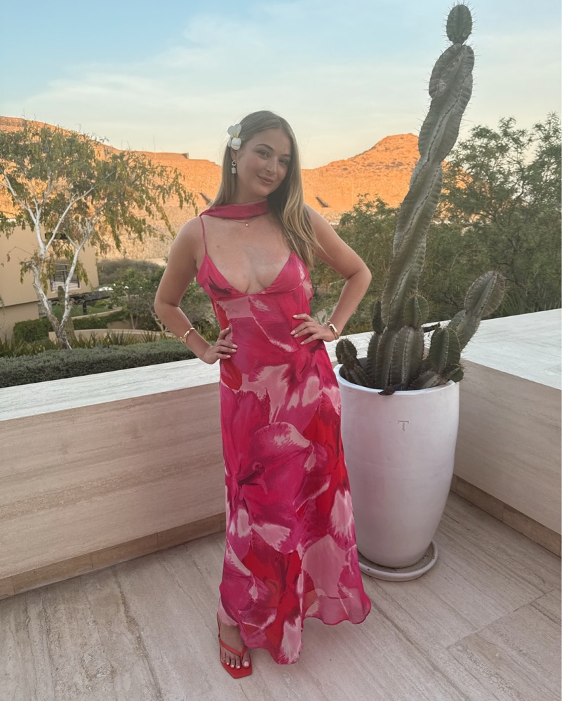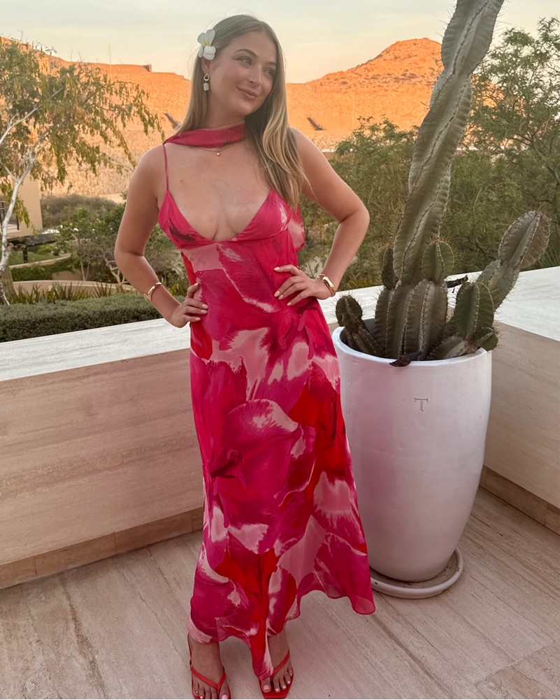 This eye-catching maxi dress is perfect for a summer vacation or outdoor event. The vibrant tropical print and daring cut-outs create a bold, fashion-forward look.