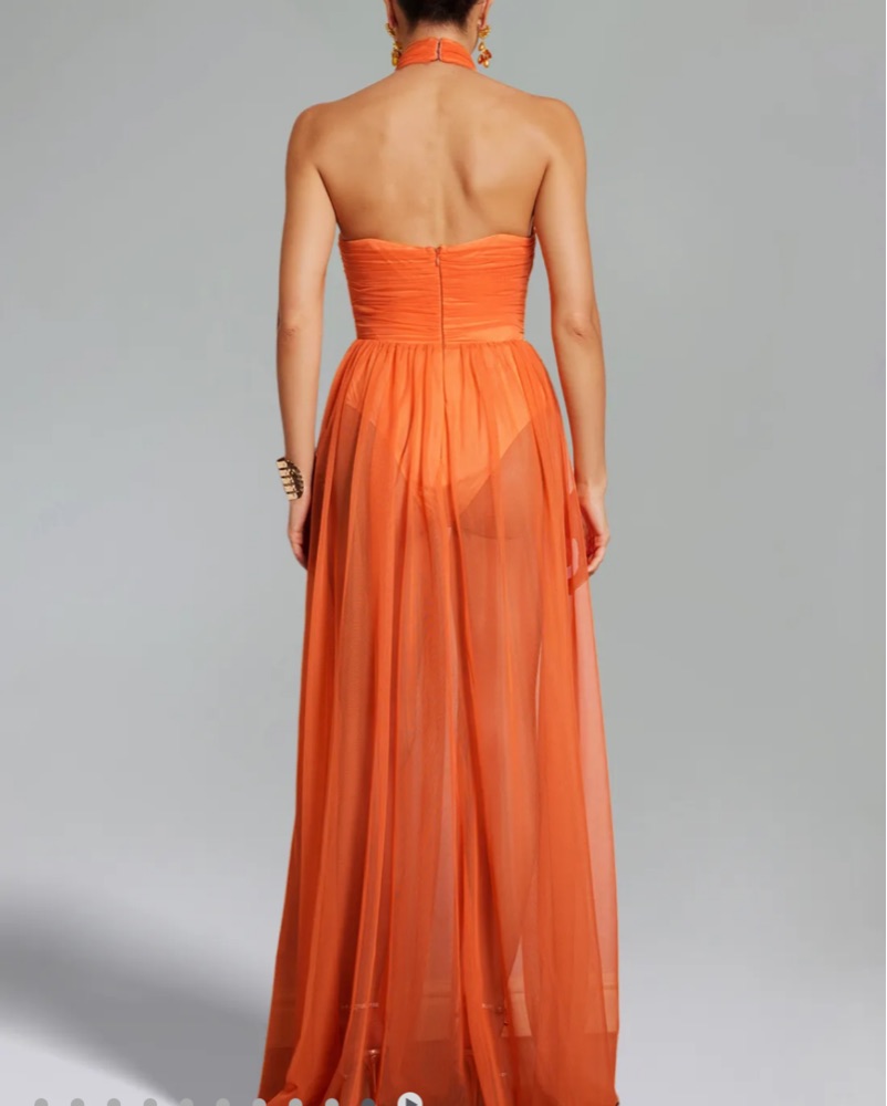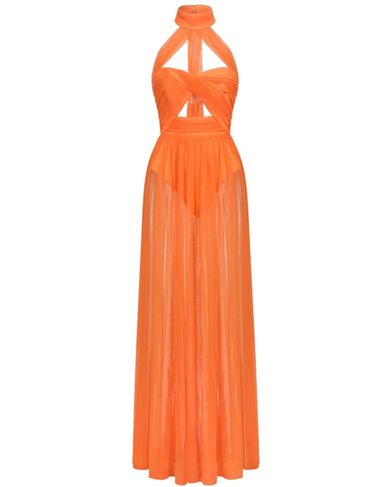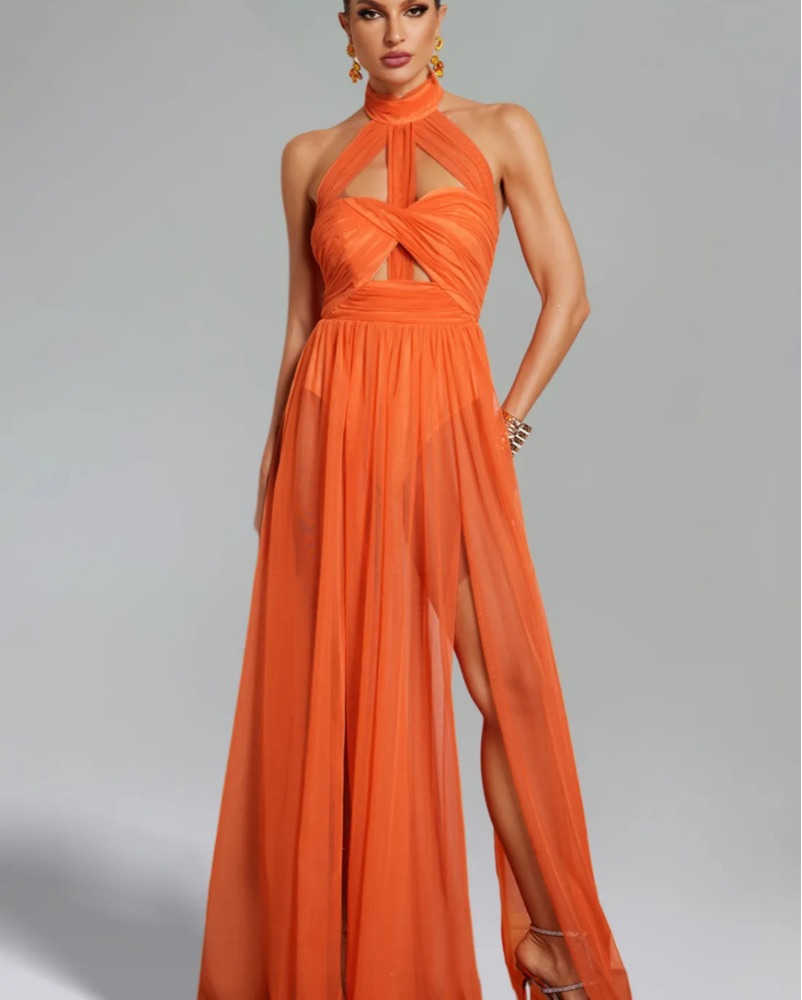 This stunning halter dress is perfect for a glamorous occasion. The vibrant orange hue and daring cutouts create a show-stopping look that will turn heads.