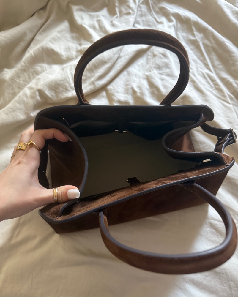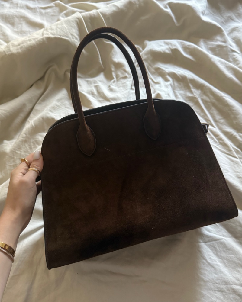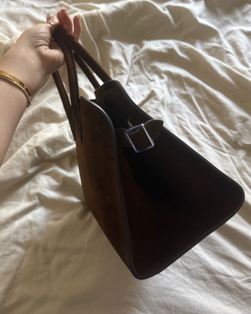 Excellent condition. Dark brown suede with silver hardware. Authentic.
