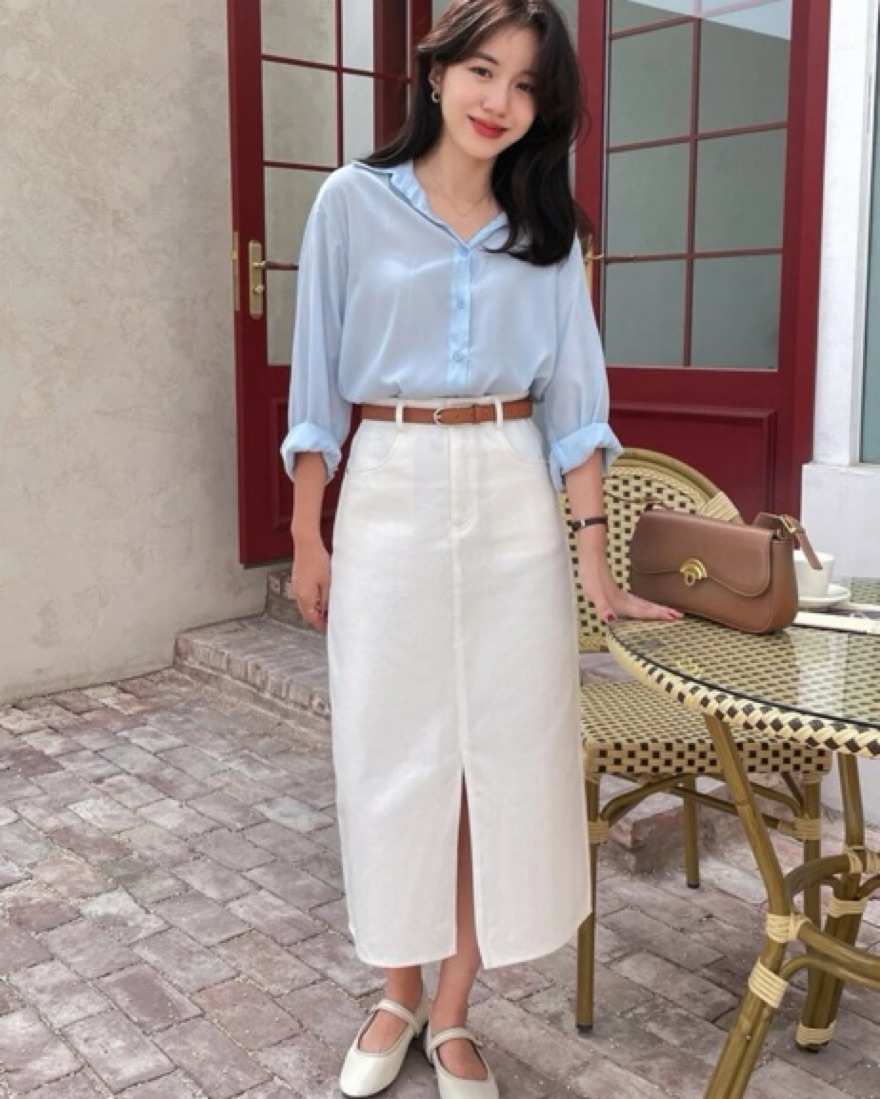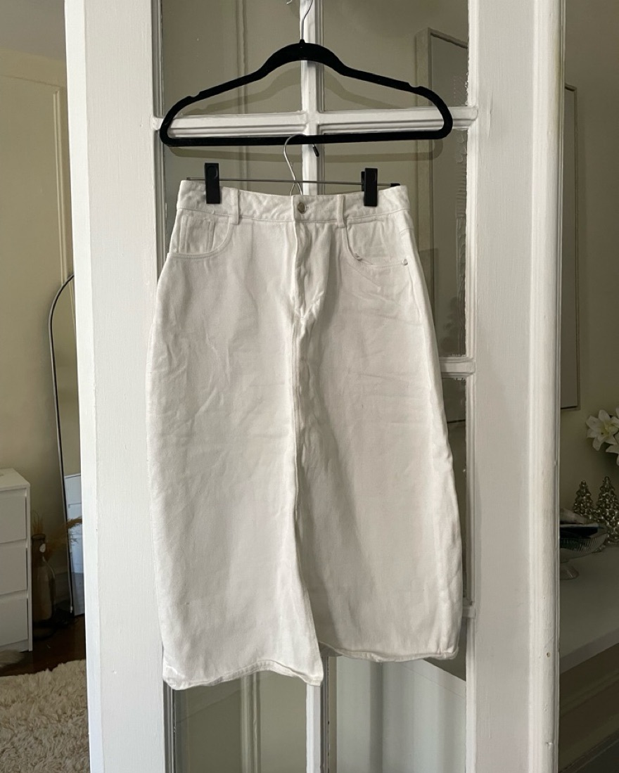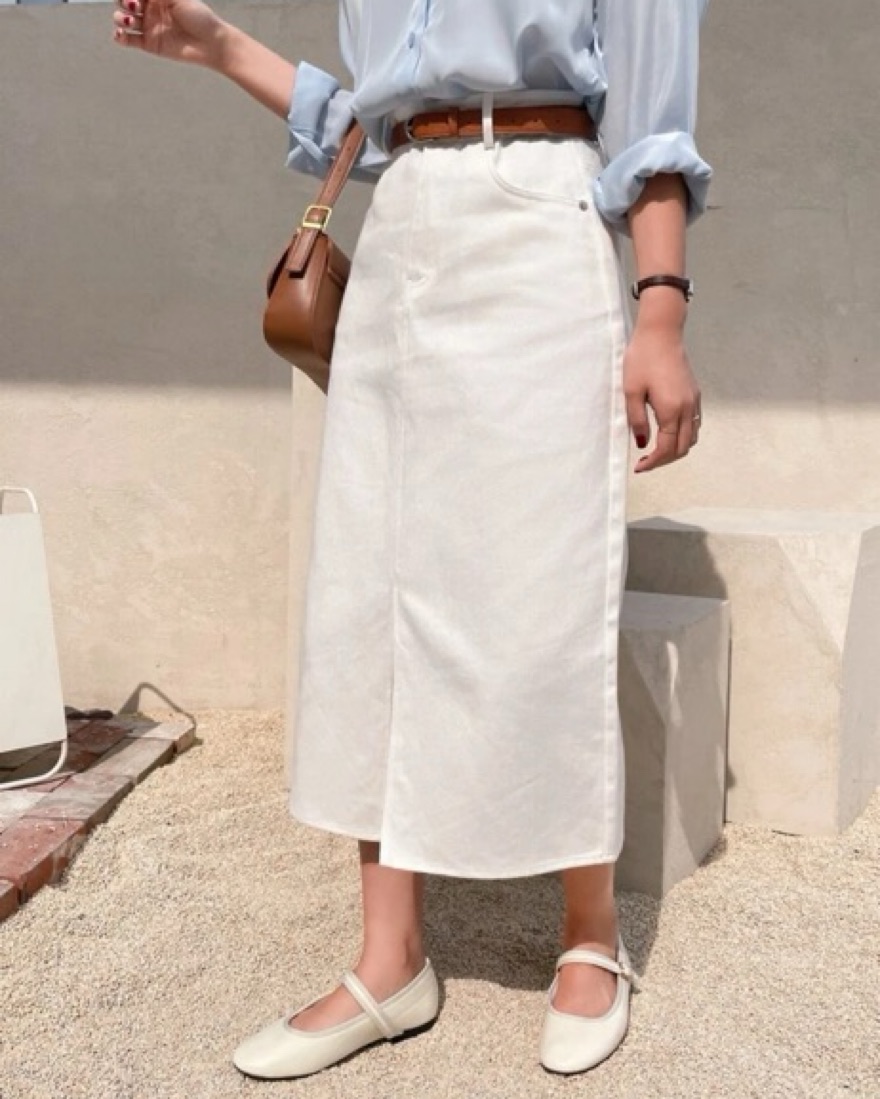 This chic and versatile white midi skirt is perfect for a variety of occasions, from a casual weekend brunch to a more formal event. The sleek silhouette and waist-cinching belt create a flattering and feminine look.