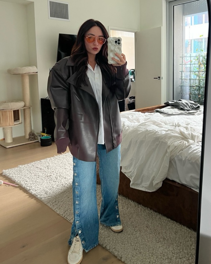 This super oversized leather jacket is great because it’s super light weight. It’s great for layering and dresses up any look! I am quite petite and it’s extremely oversized. This will fit more s-L. If you wanna buy it. I’ve worn it less than 3 times :)