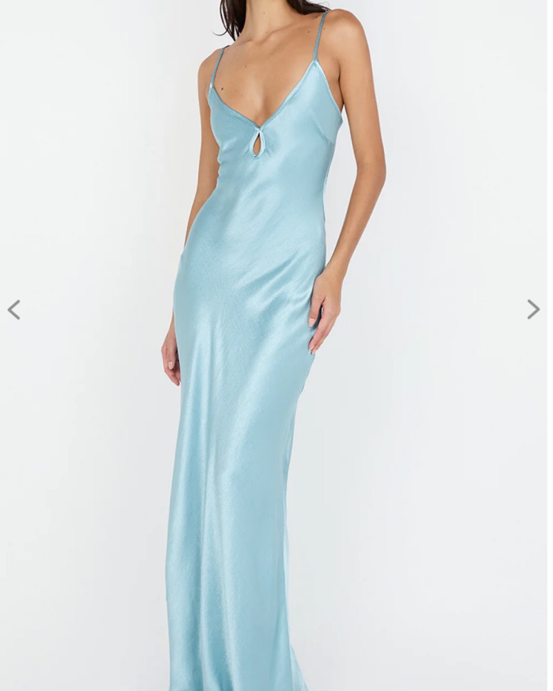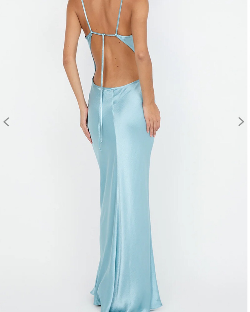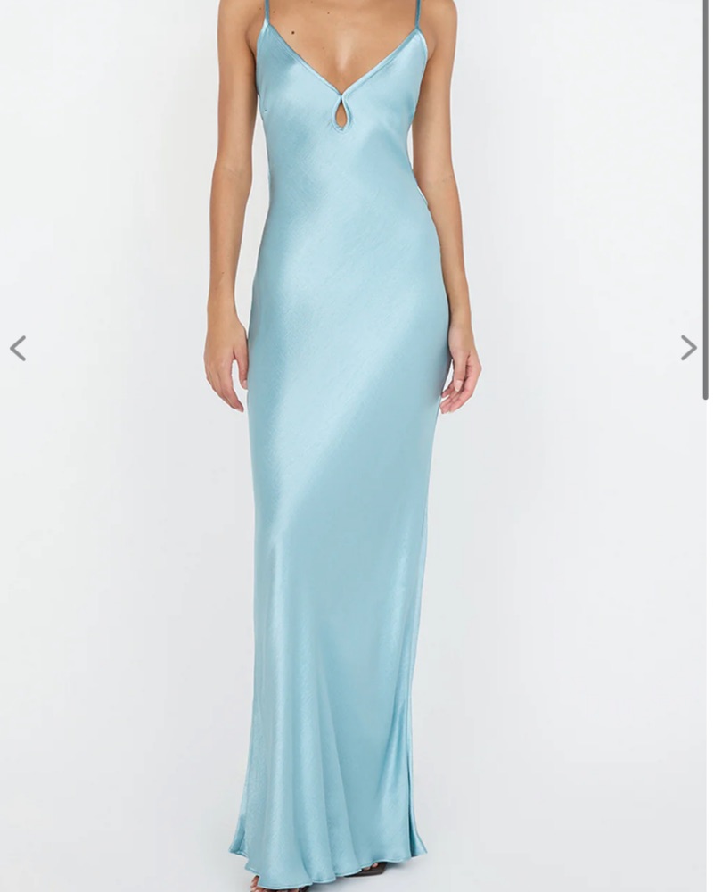 A stunning satin maxi dress perfect for a formal occasion or special event. Worn once, runs TTS adjustable ties at back, delicate fabric please be careful I am 5,7 for ref
