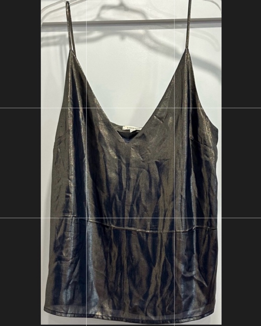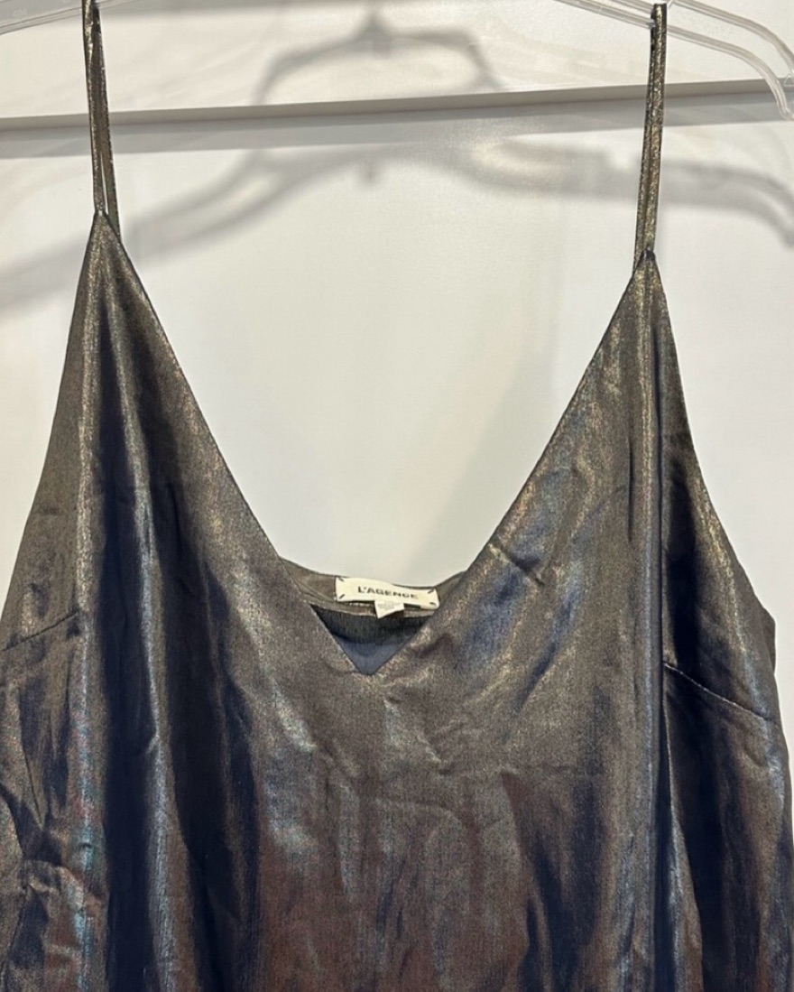 Fashioned from a silk chiffon w/ metallic gold foil woven throughout for a liquid look w/ navy undertones ••sharp V-neckline ••slender, adjustable straps ••minimalist, streamlined silhouette ••lightweight ••darted cups ••attached dual layers