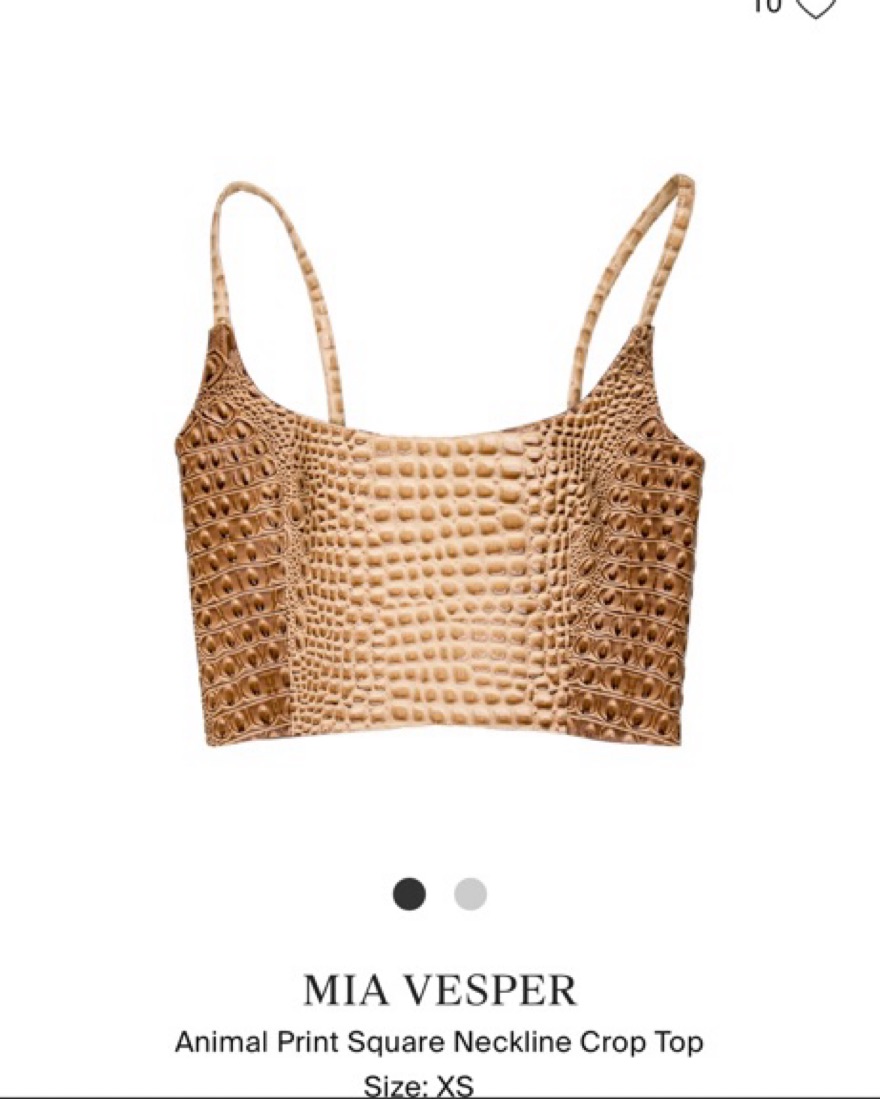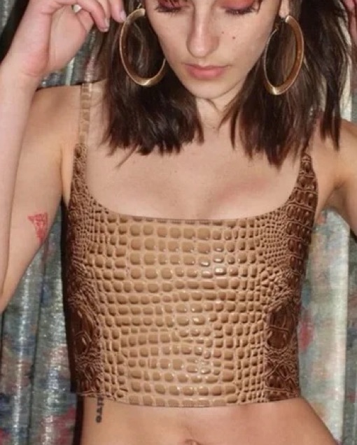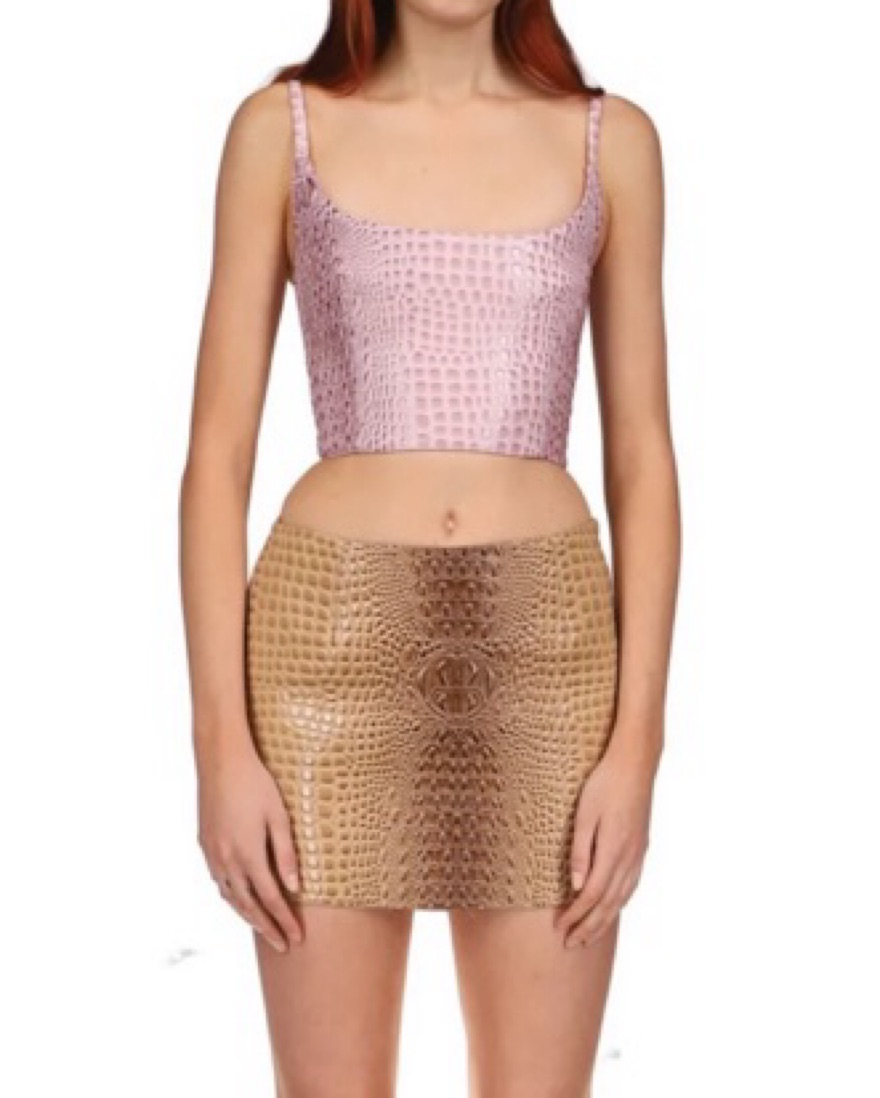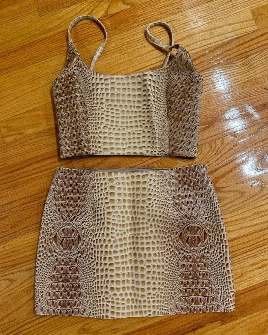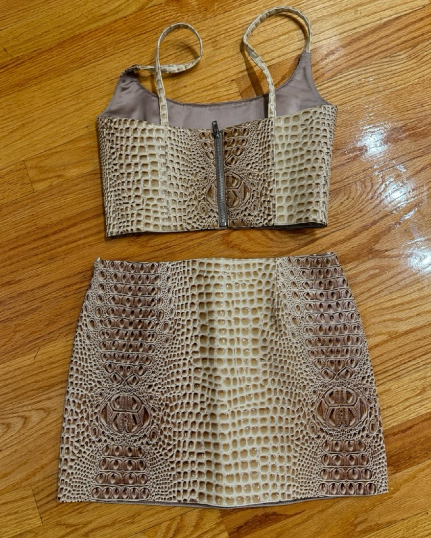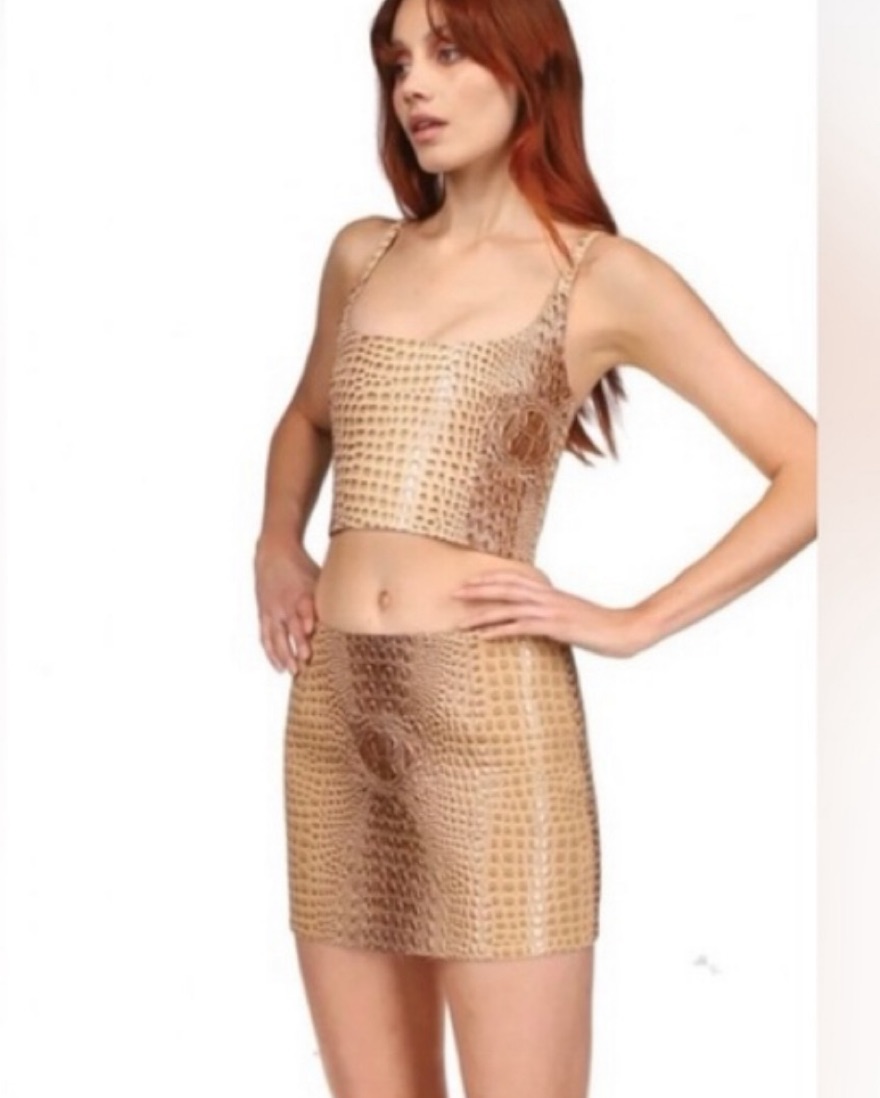 Brand new discontinued Mia Vesper Obscura leather croc tan matching set crop top and mini skirt