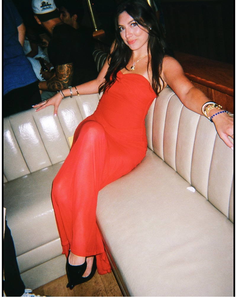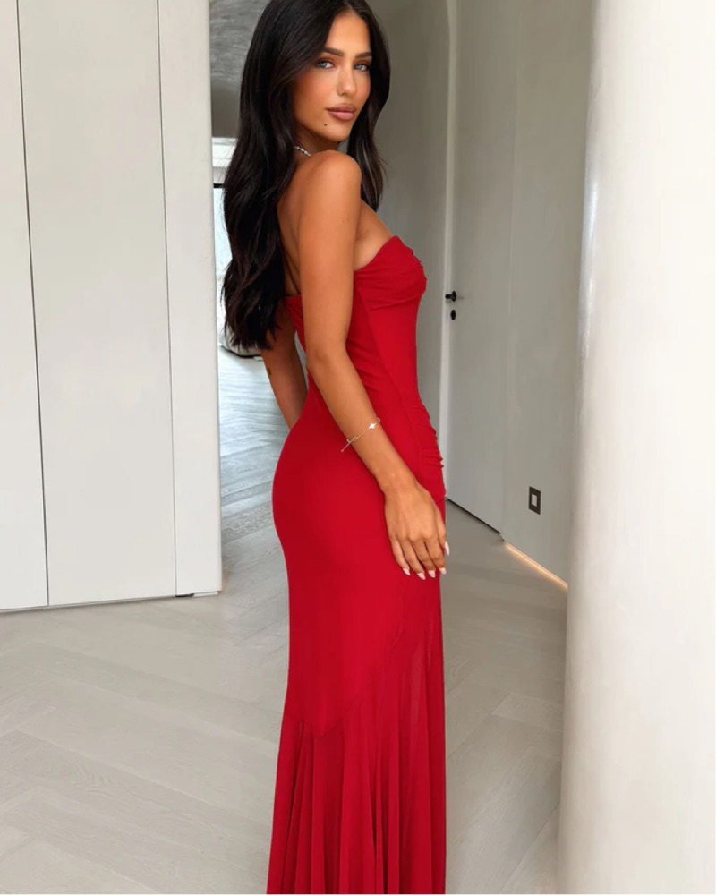 The Tasmin Maxi Dress is both elegant and playful. Made from mesh fabric, it features a strapless design and a lined torso for comfort and style. The flowy skirt adds movement to your look, while silicone tape on the inside of the neckline ensures a secure fit. Pair with heels and gold jewellery for