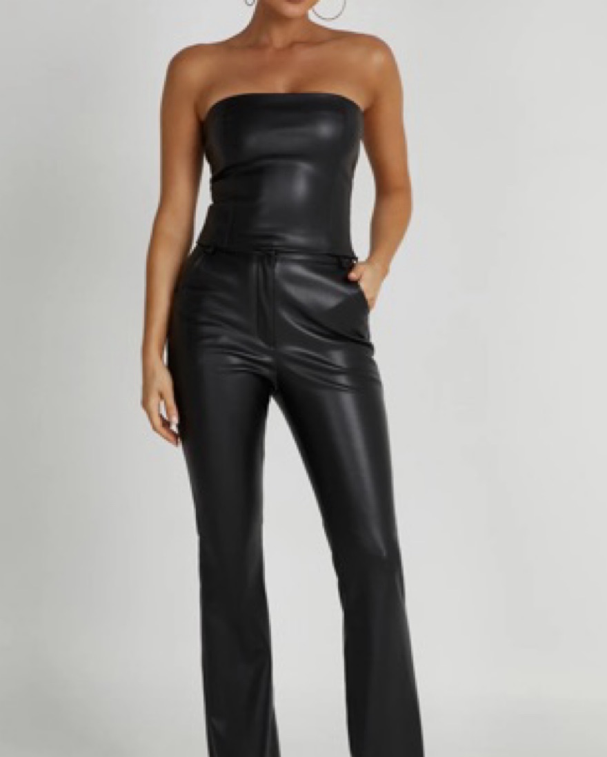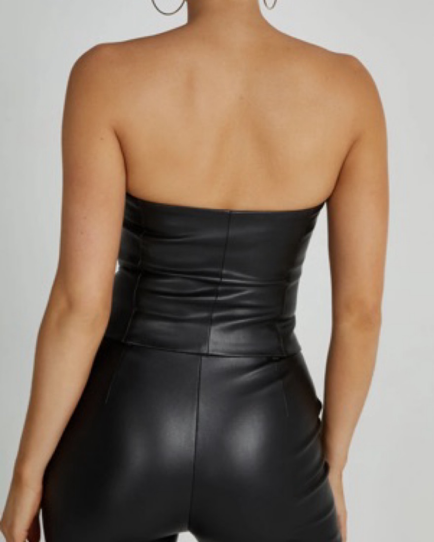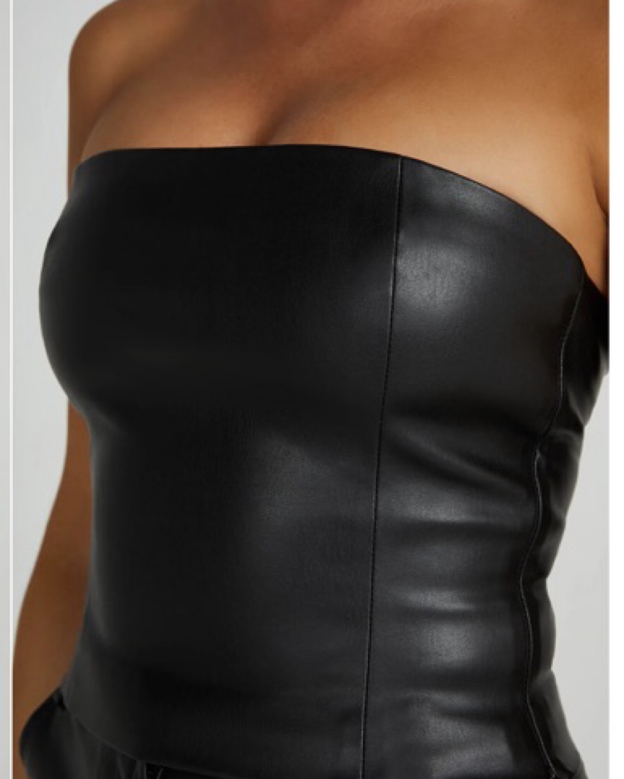 Meshki Faux Leather Strapless Crop Top in Black. Size large