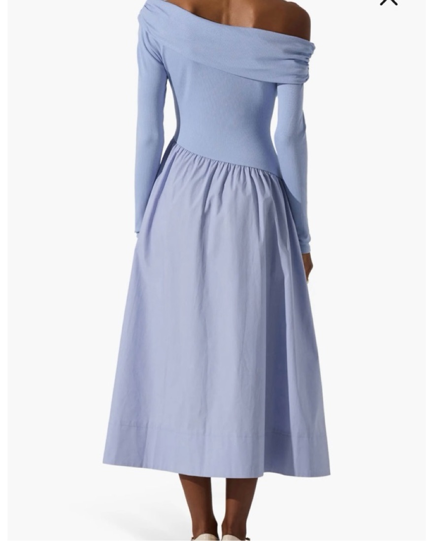 This stunning off-the-shoulder midi dress in a lovely periwinkle blue hue is perfect for a daytime event or special occasion such as a bridal/baby shower.
