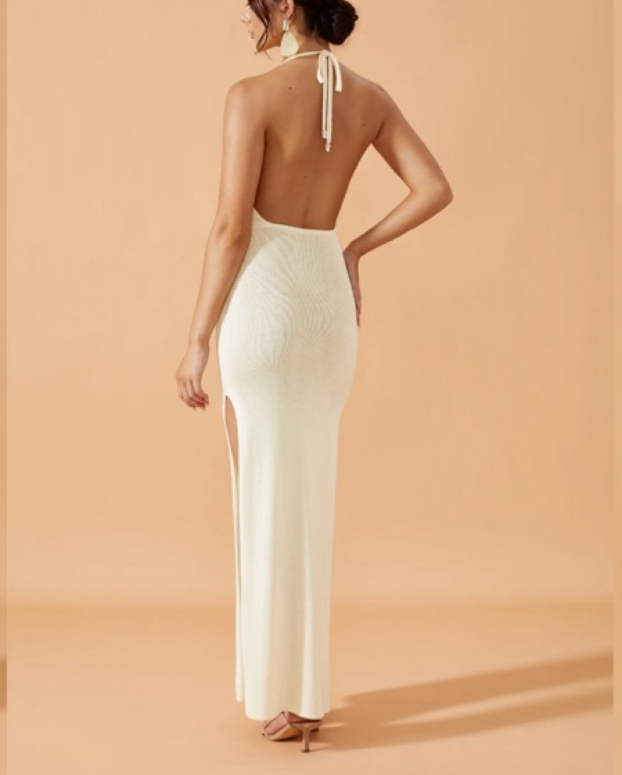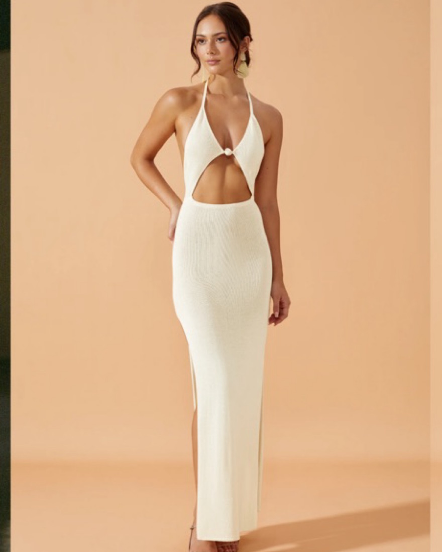 This chic white maxi dress is perfect for special occasions. The halter neckline and cutout detail create a modern, sophisticated look. Zoelle dress in buttermilk