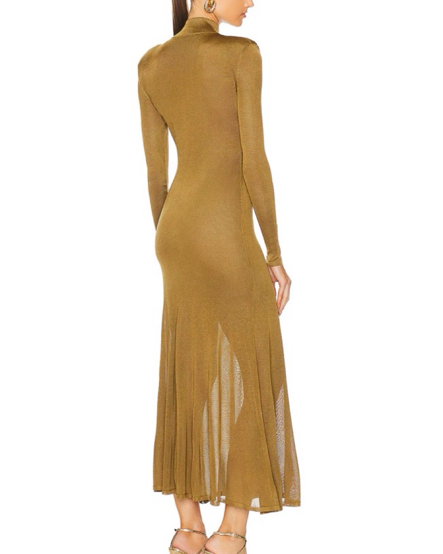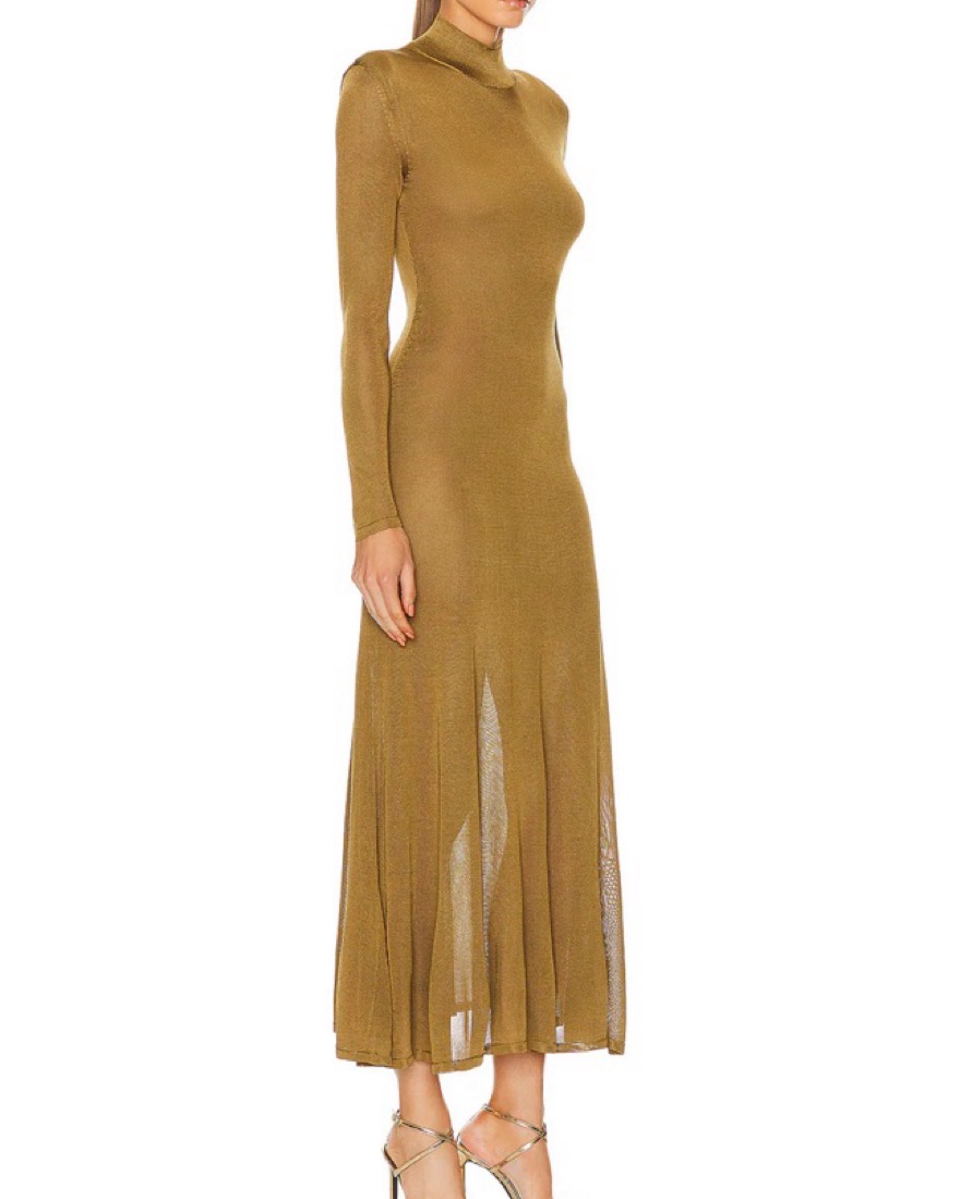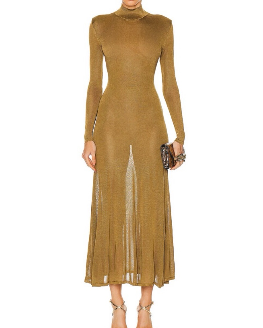 Semi-sheer form fitting dress with turtleneck and shouldpads for the most flattering silhouette. Dress up with heels or down with a blazer or oversized trench. Ideal for a special dinner or a classy, sexy night out