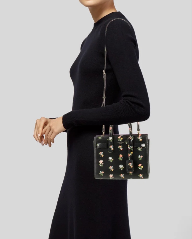 This striking satchel handbag features a bold floral print in a sophisticated black background, perfect for adding a touch of elegance to any outfit.