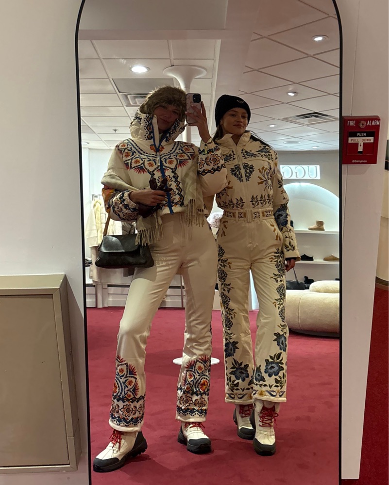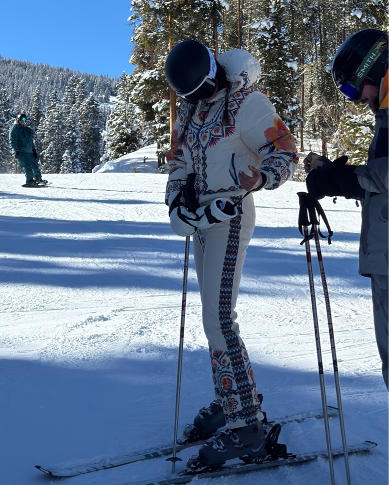 Two piece ski suit. Limited Rio X white space collab. Long enough for the tall girlies. Pants have an overalls strap on the inside and jacket is puffer style with a hood.