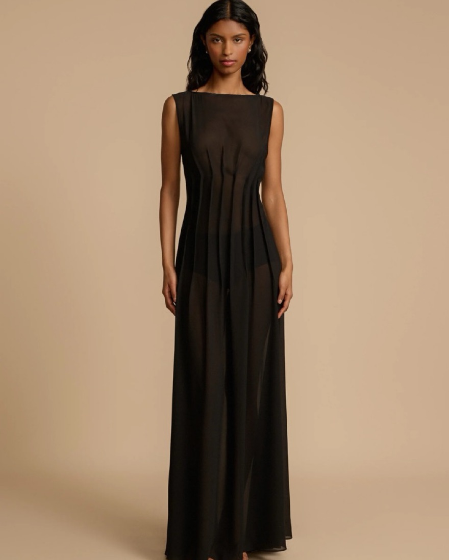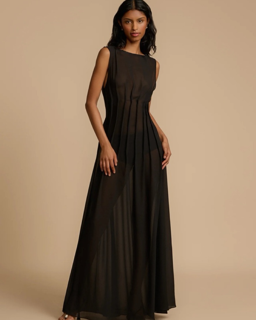 Arcina Ori black ‘Audrey’ maxi dress with gorgeous pin tuck detailing to cinch it in at the waist and a boat neckline. It’s unlined and a crepe material that’s fairly transparent.