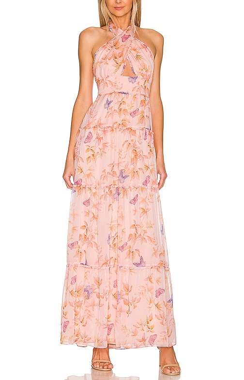Flutter sleeves and a flowy maxi silhouette make this dress perfect for garden parties or beach getaways. Romantic and effortlessly elegant.