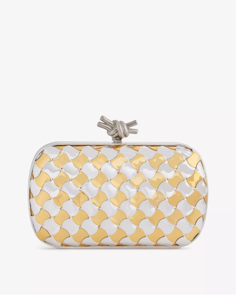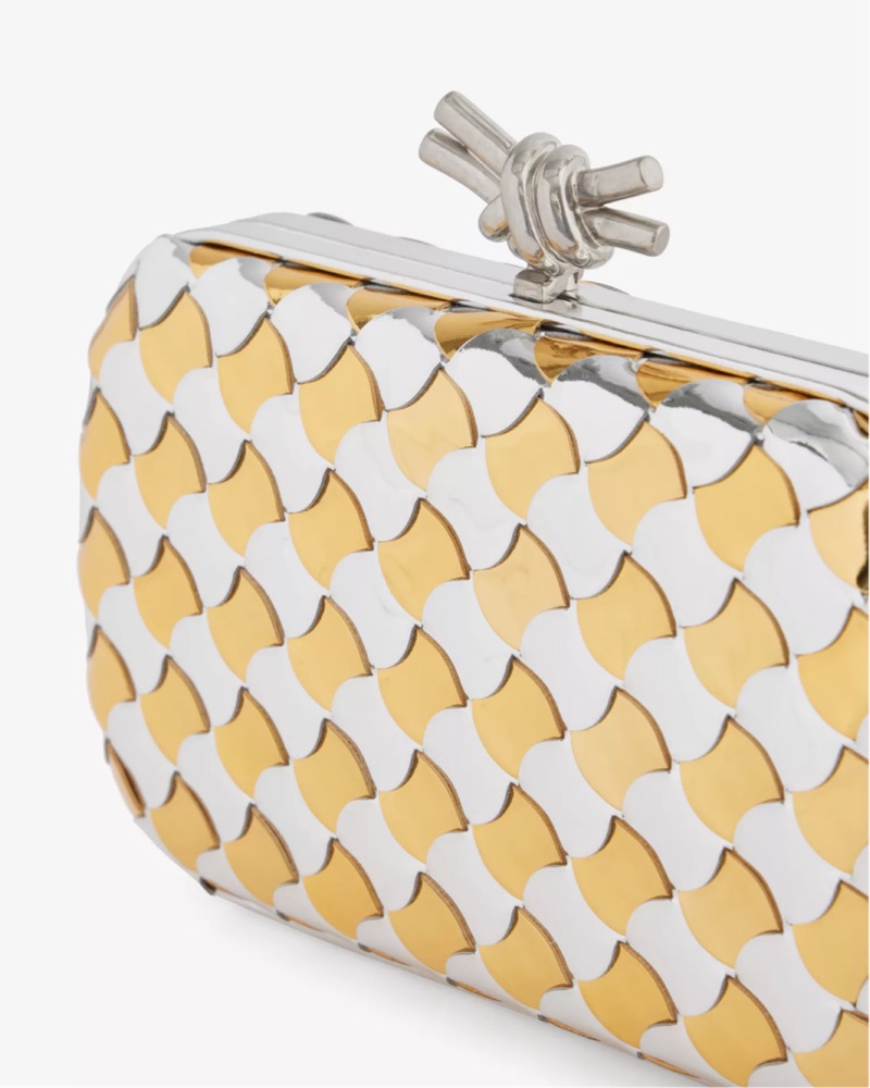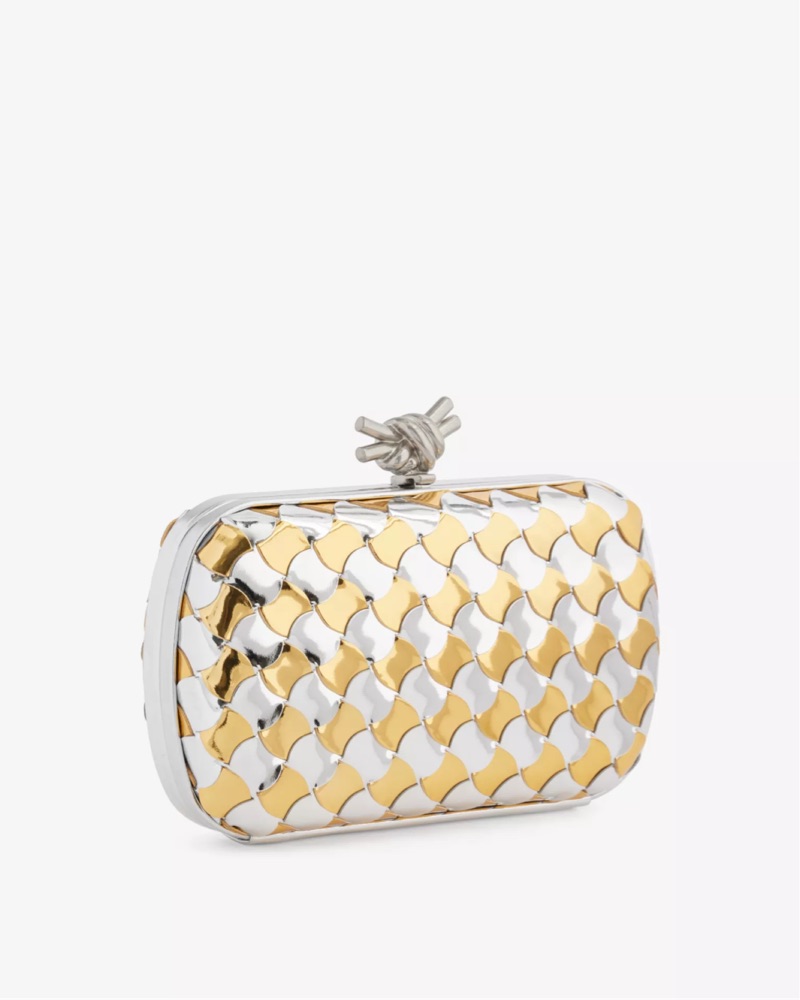 This sleek Knot intrecciato-weave metallic-leather clutch bag features a metallic, scale-like pattern that adds a touch of glamour to any outfit. Ideal for an evening out or special event.