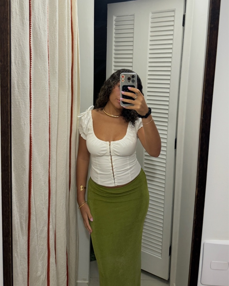 Size medium but got altered to fit me. 34c, typically 4 in tops, 27/28 in pants. I would say it fits between a size small and medium! :) dm me if have questions