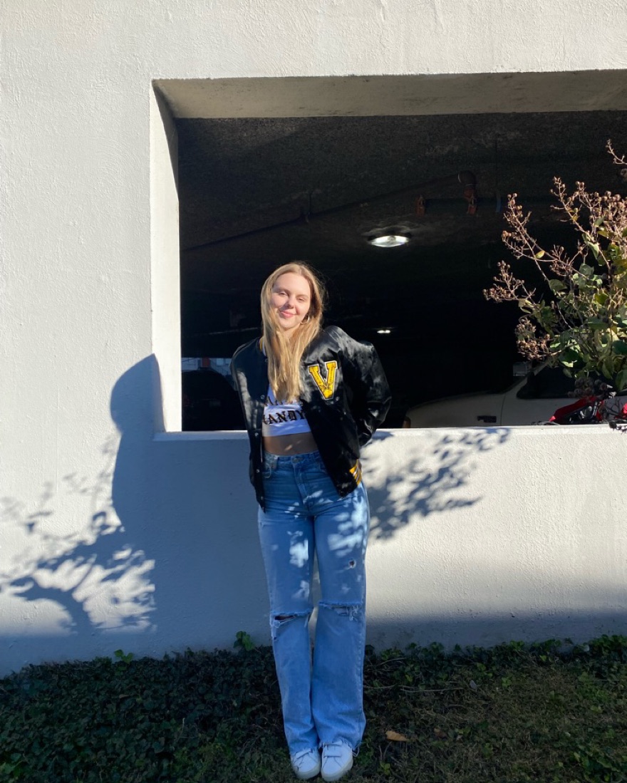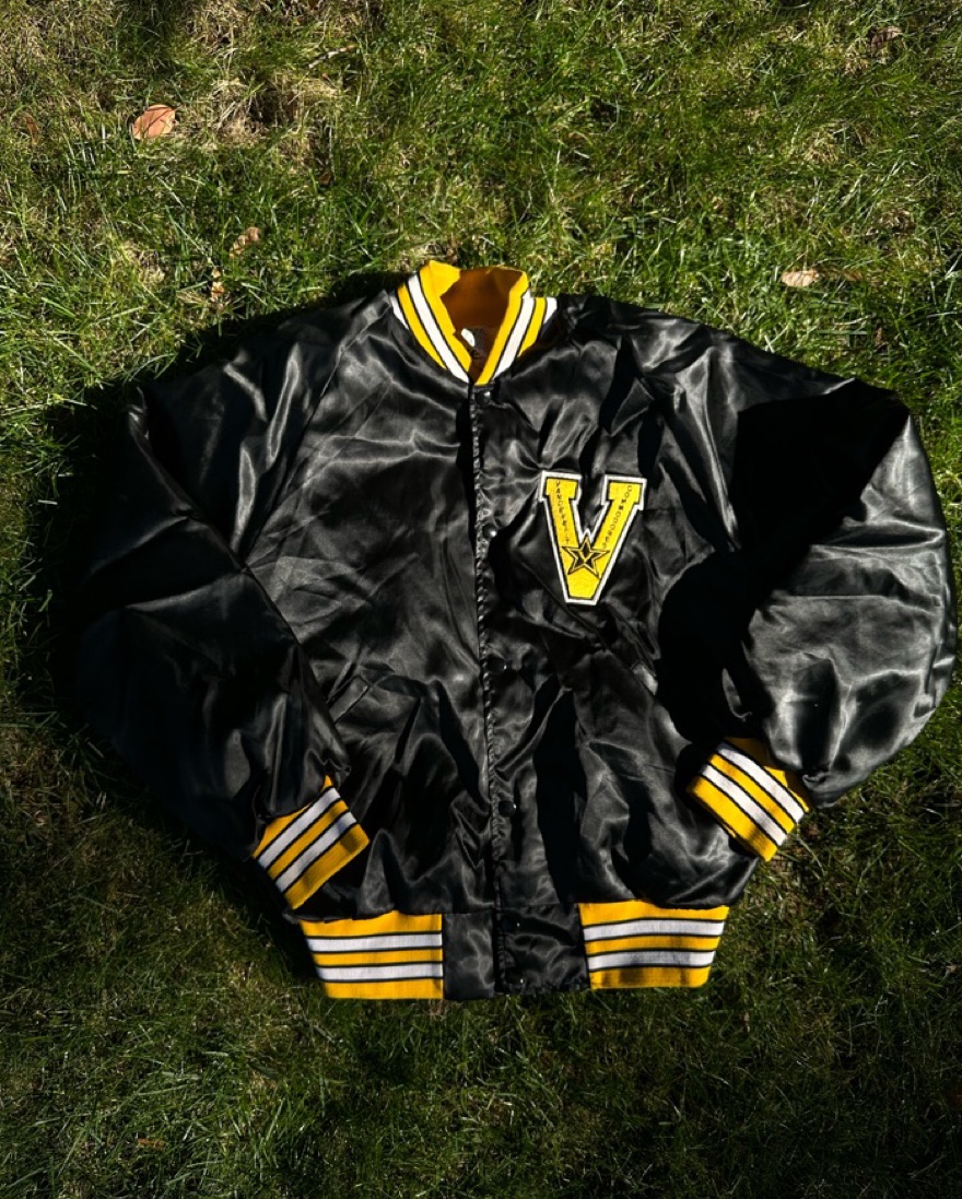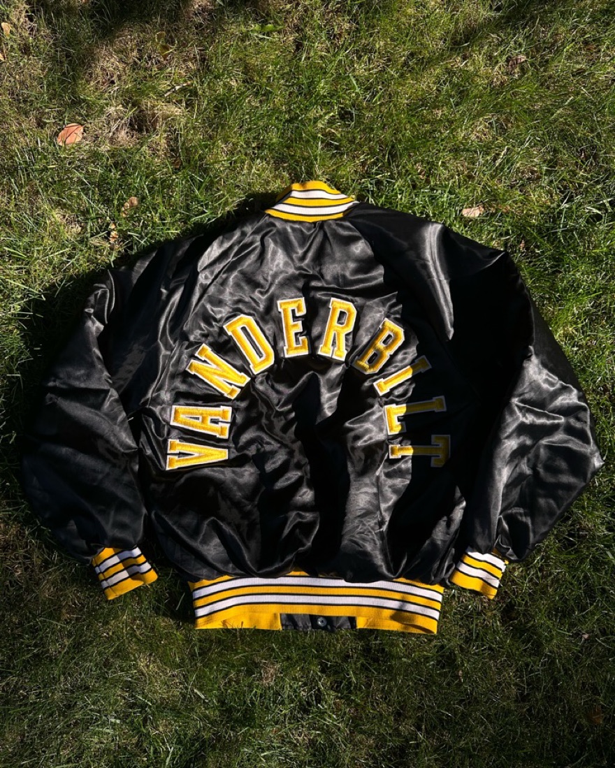 Vanderbilt University blaxk satin bomber jacket with gold detailing on both sides, sourced by Tailgate Teens on Instagram. Whether you’re getting ready for an upcoming tailgate or looking to elevate your street style with a sick vintage piece, this is the perfect piece for you. Go Dores!