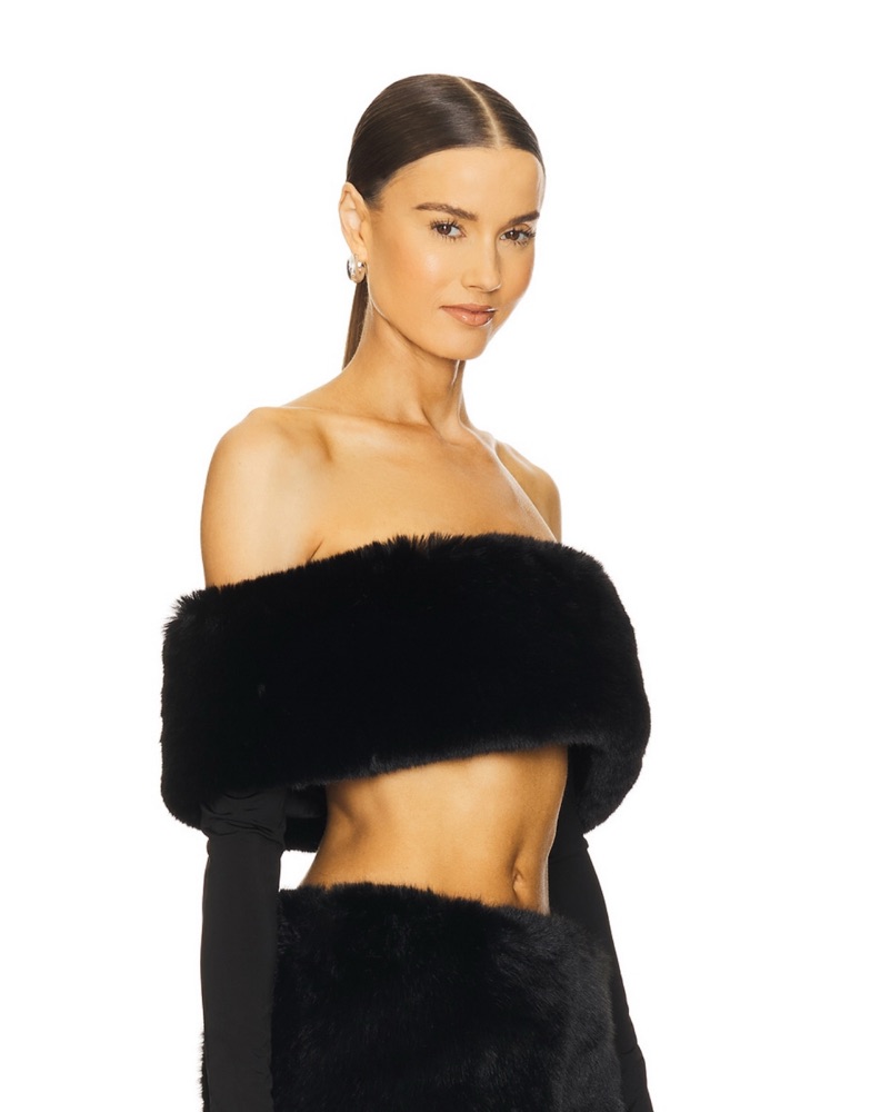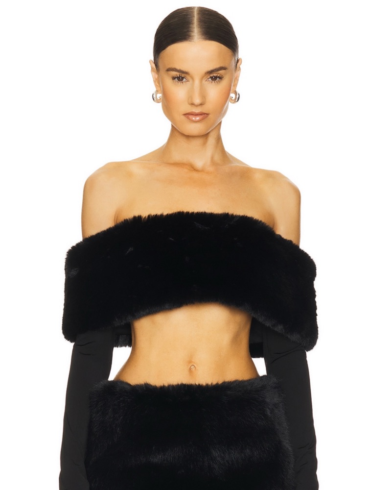 This luxurious faux fur set is perfect for a chic night out. The off-the-shoulder crop top and high-waisted mini skirt create a flattering, alluring silhouette.