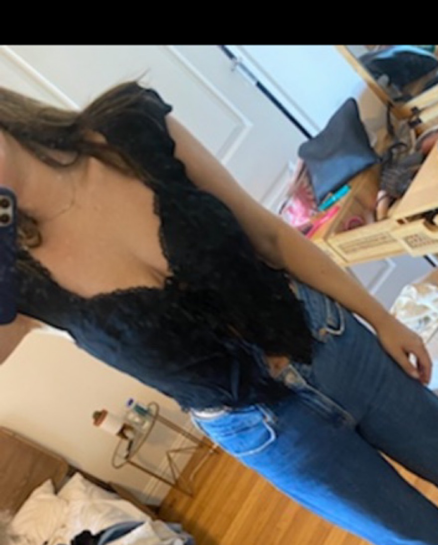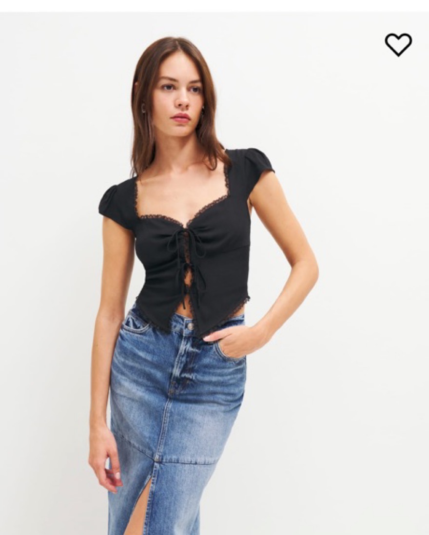 Very cute ref black short sleeve blouse with ties. Theres also a third clasp in case you want more coverage. Size 8, but if you have a larger chest and are a 4/6, this will fit!
