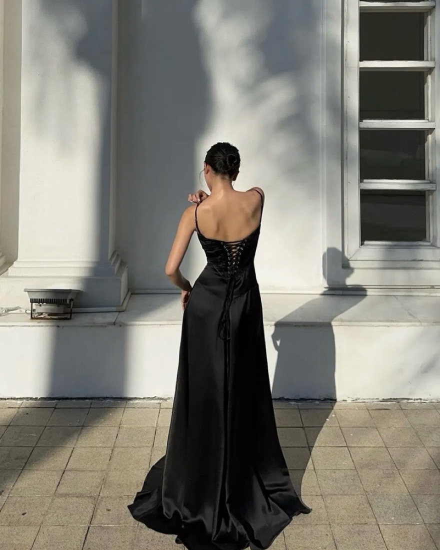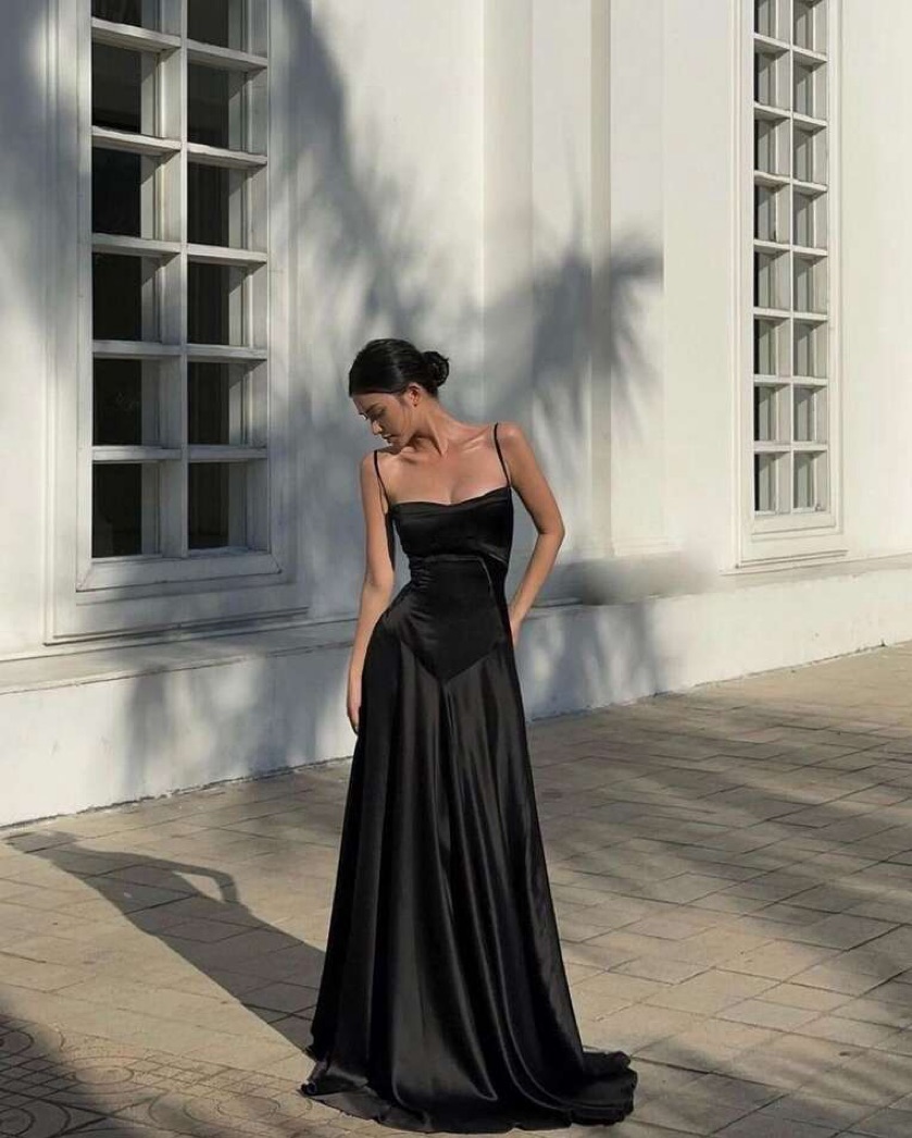 black satin gown that’s perfect for a wedding or a black-tie event! it’s a sculpted corset-style dress with a lace-up back, built in bra, and adjustable straps. can fit sizes 4-8 and bra cup sizes a-c.