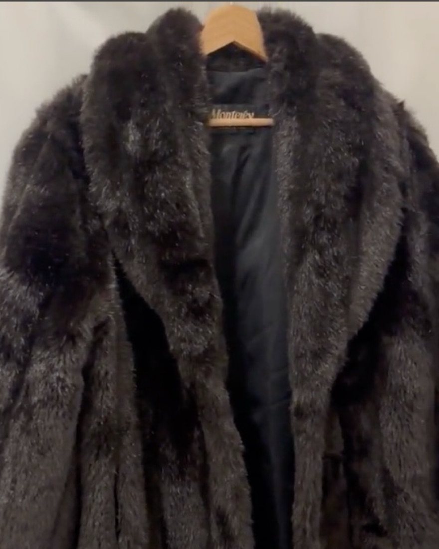 It’s faux fur!! But looks and feel real. It’s floor length, slightly oversized and keeps you warm :)