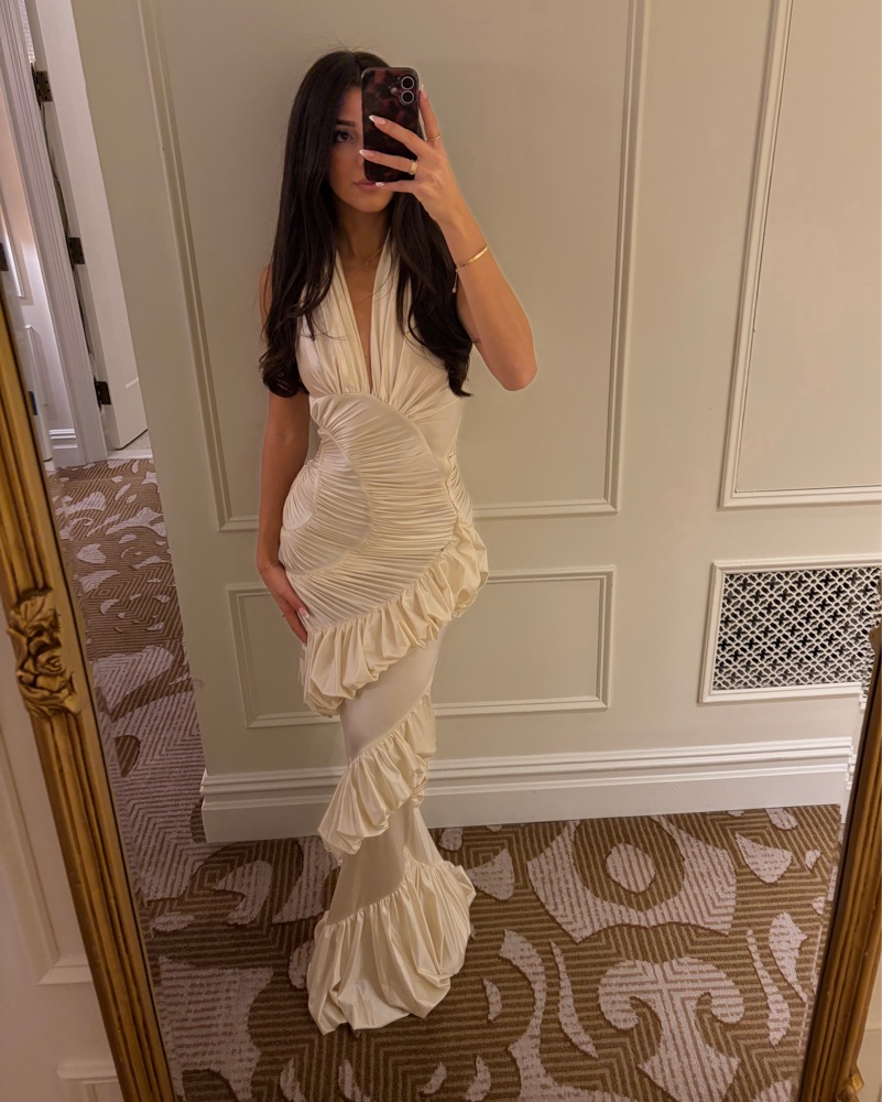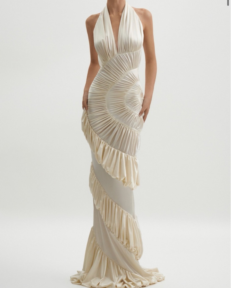 Great condition, worn once for my engagement shoot. Silk spandex material with a side zipper. Hourglass shape. I’m 5’7 and a size 2.