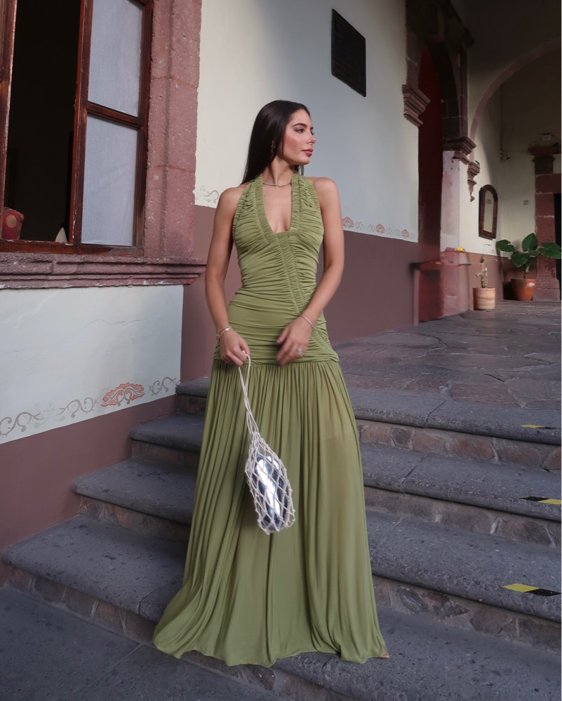 This stunning olive green maxi dress features a plunging neckline and figure-flattering ruched details, perfect for a romantic date night or special event. Please be aware this dress does have some small tears at the bottom that are hardly noticeable.