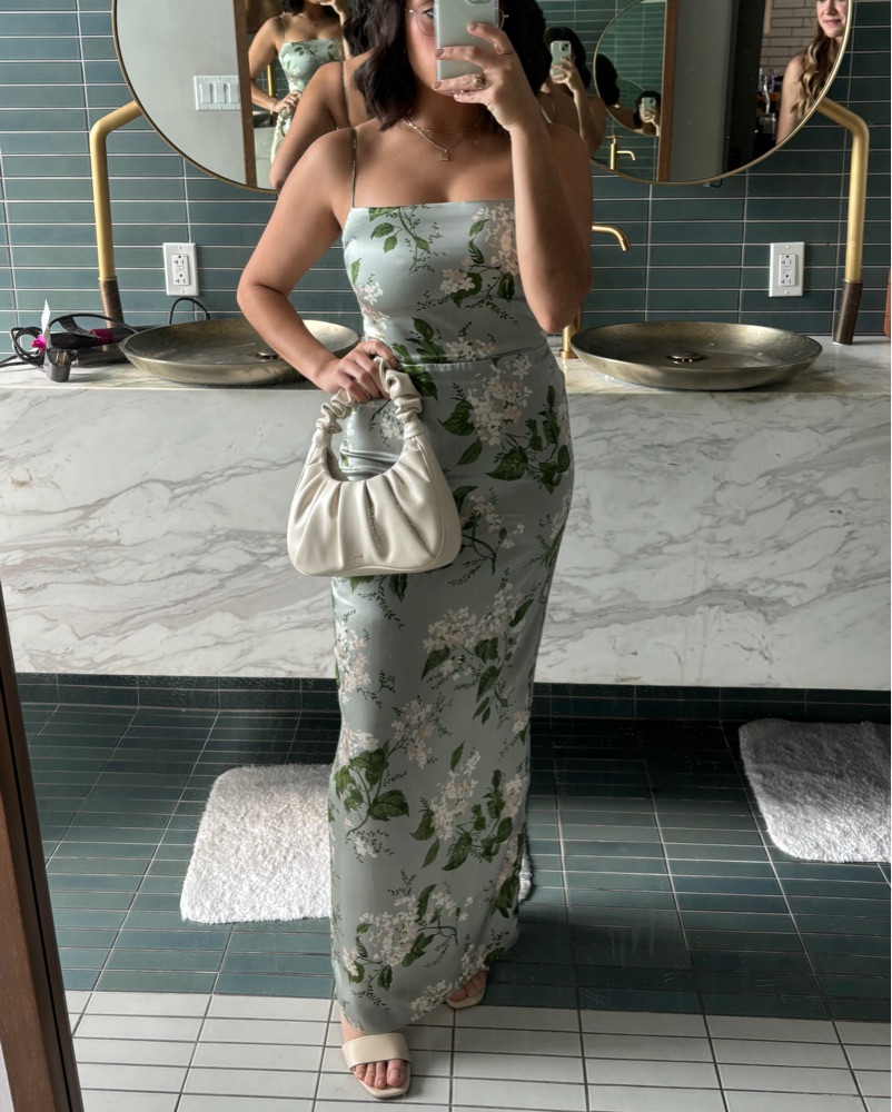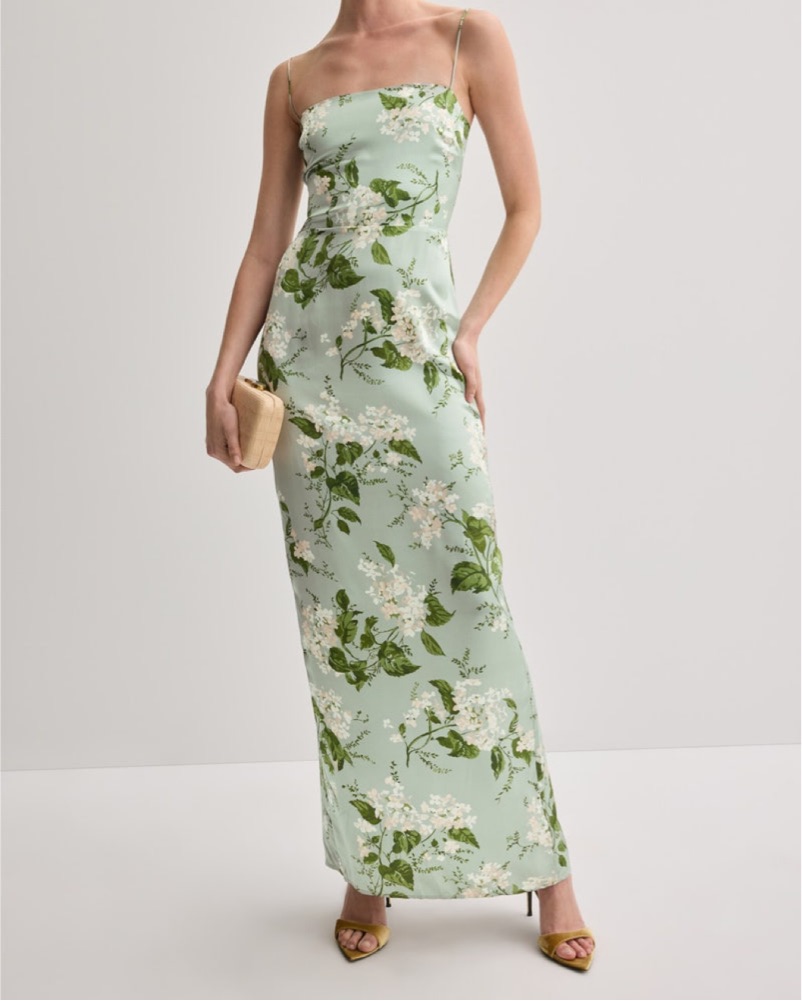 Marguerite floral-print silk maxi dress from Reformation featuring sage green, silk, all-over floral print, adjustable spaghetti straps, with a fitted waistline and front slit. Size 4