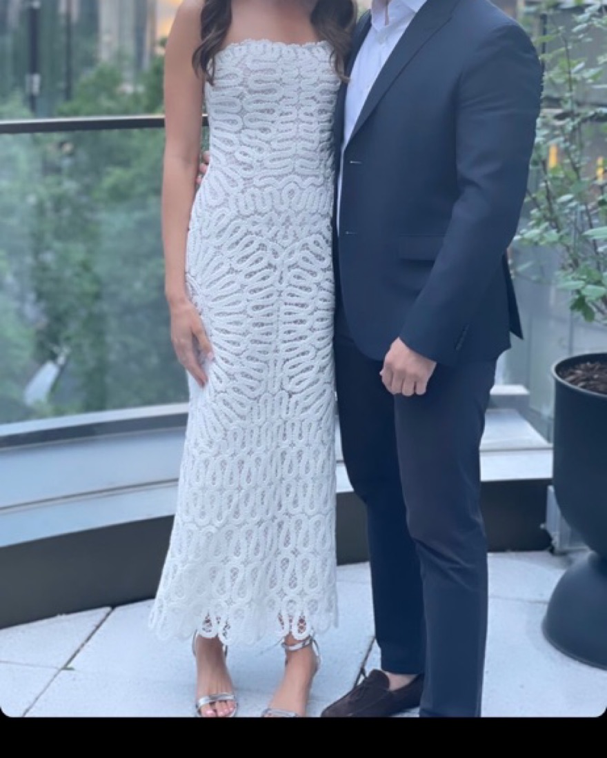 Simkhai white crochet embroidery dress. Perfect for any bridal event. Had the bottom slightly altered to be less A-Line.