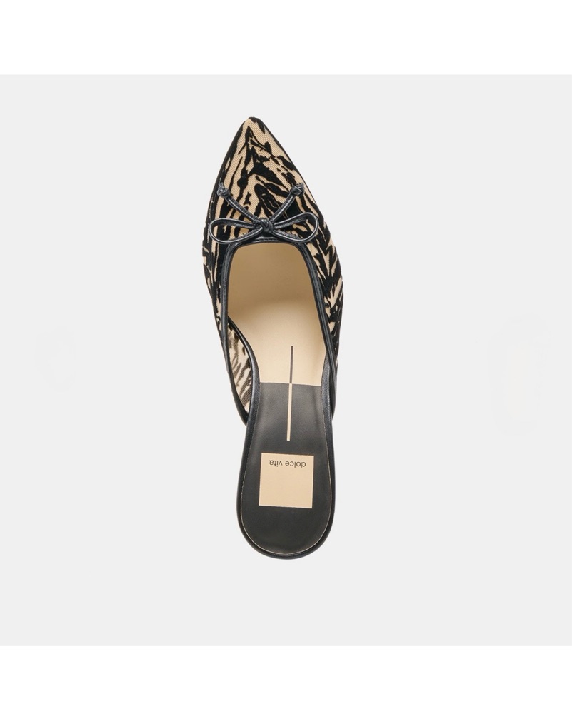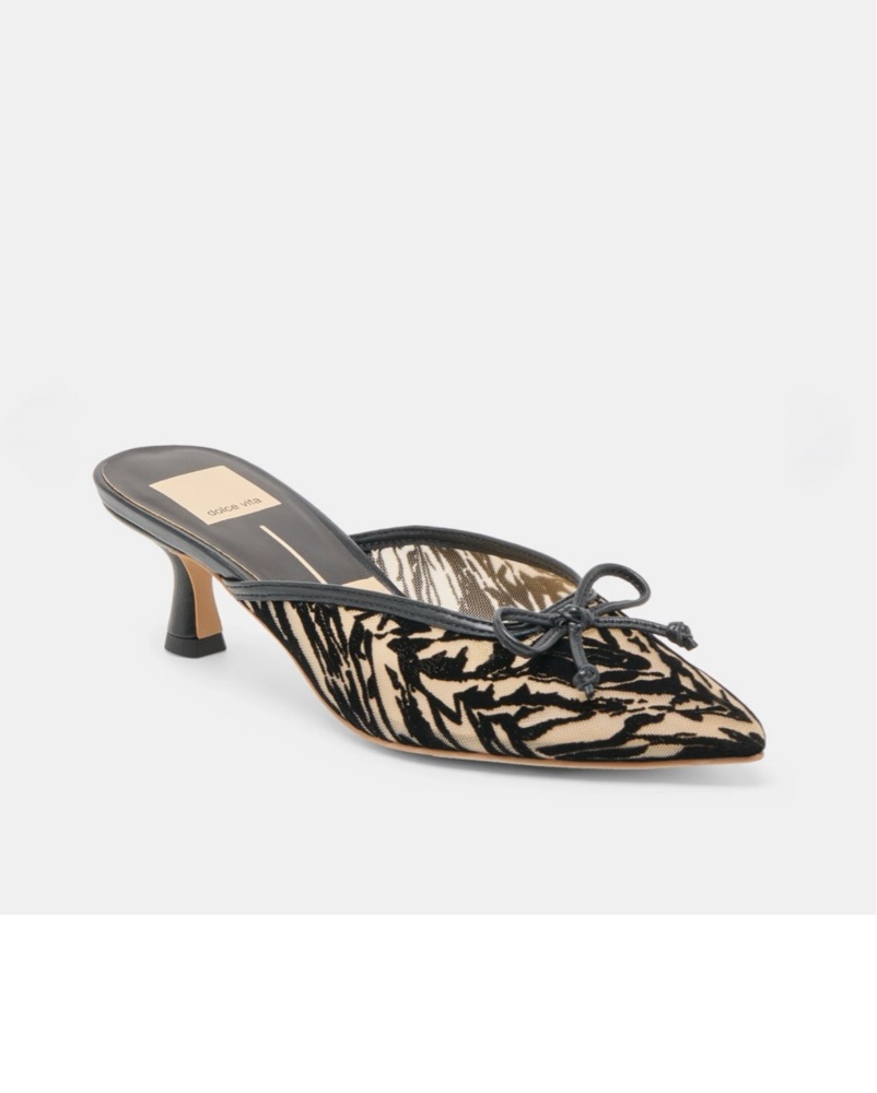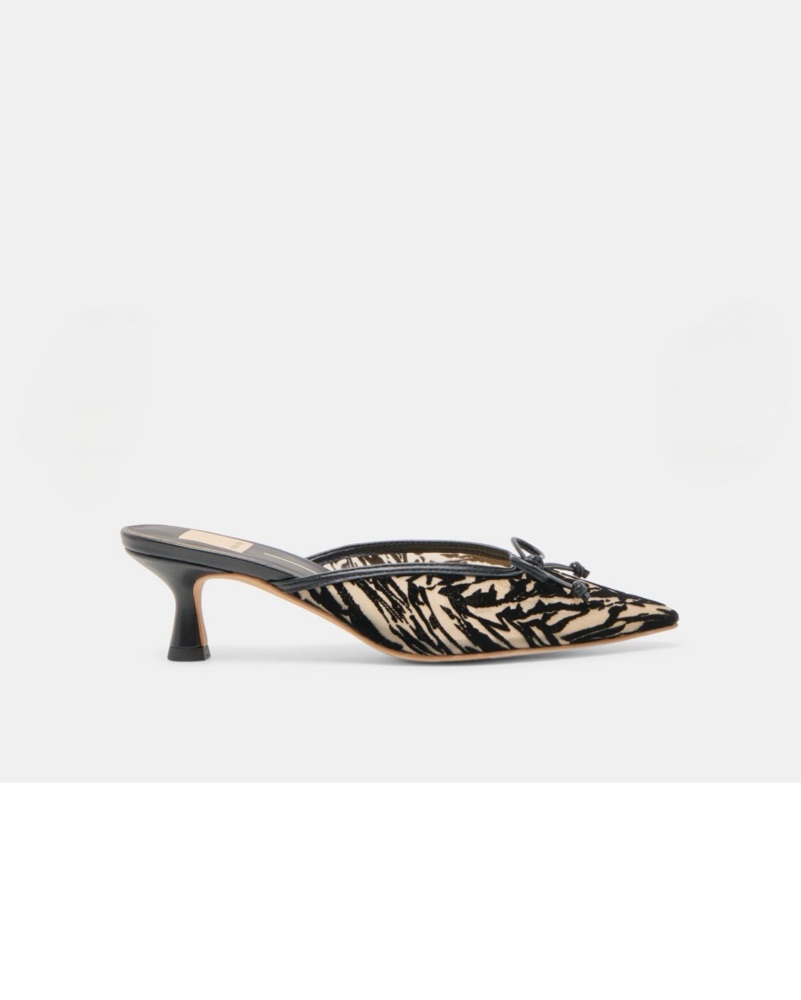 zebra velvet mesh pointed kitten heels that’s perfect for dinner parties to weddings. heels are 2 in.