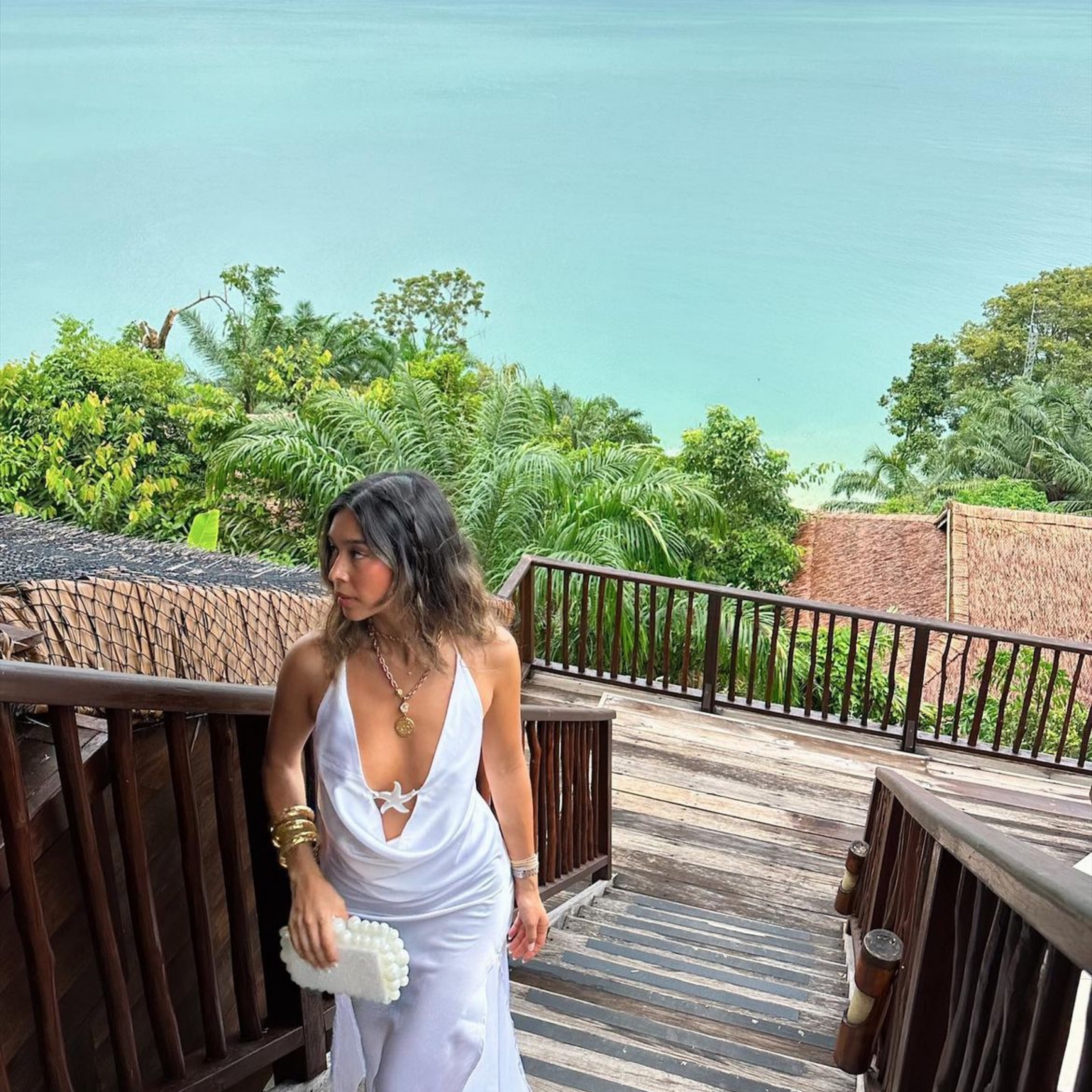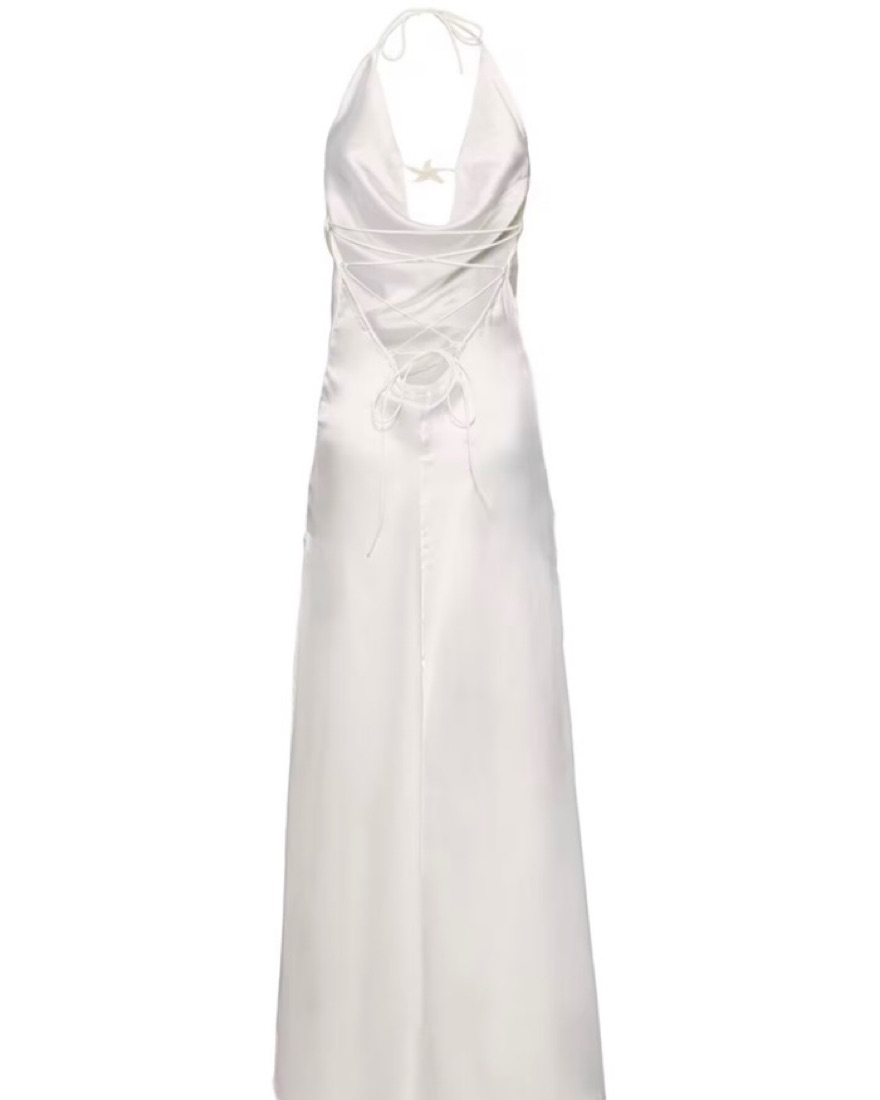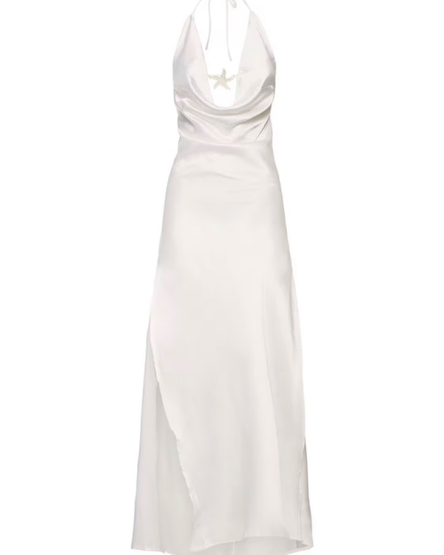 Stunning pearly white with cowl neck, criss cross tie back, and a star detail!!