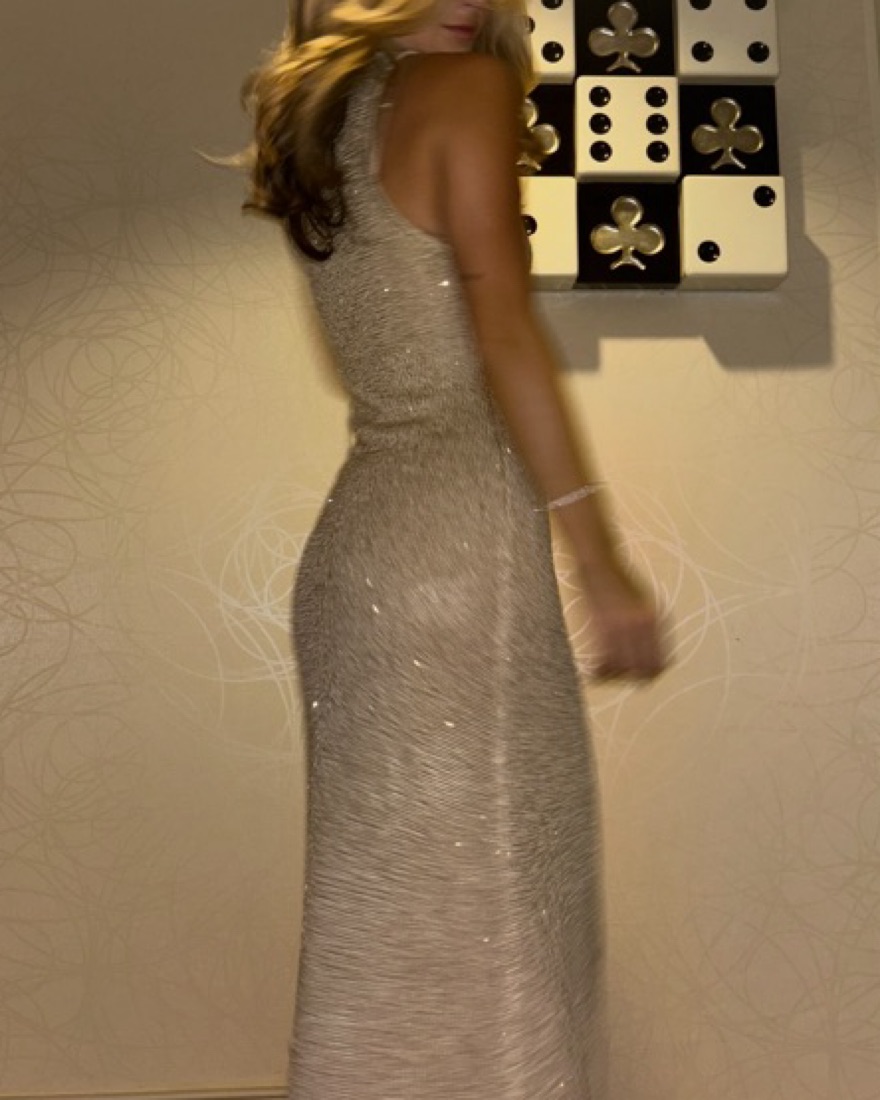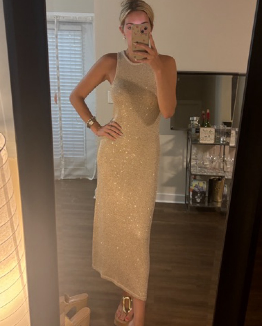 Gold / Cream knit maxi dress with sequins. Fabric is stretchy and not itchy