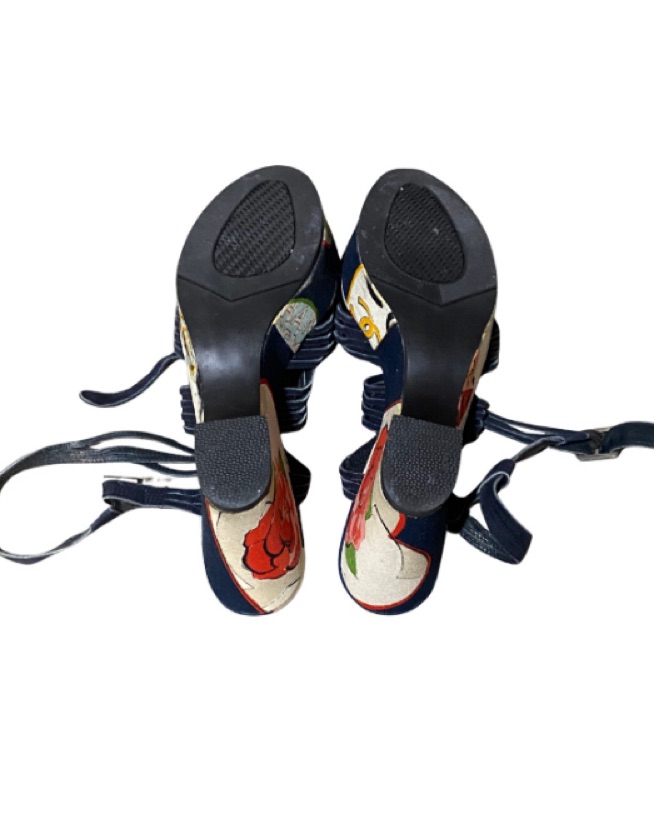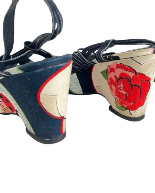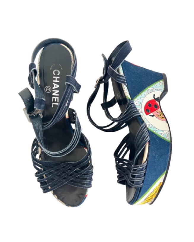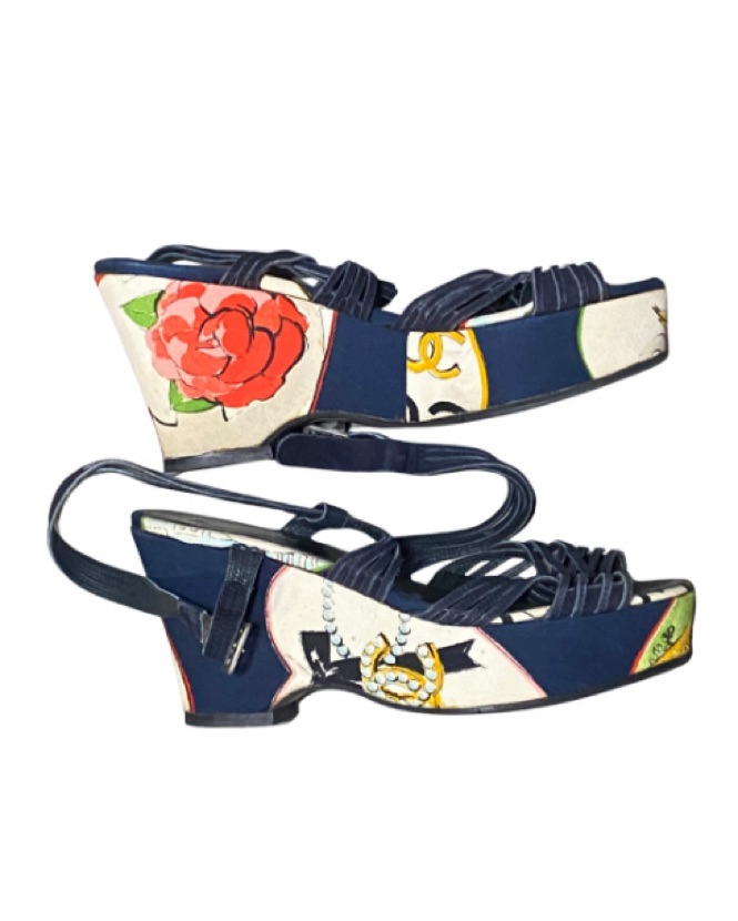 Beautiful vintage canvas wedges by Chanel featuring various printed graphic designs such as pearls, flowers, lady bugs and the Chanel logos. Has a strappy criss cross style vamp with heel strap made of suede and a Chanel branded silver buckle closure. US 8.