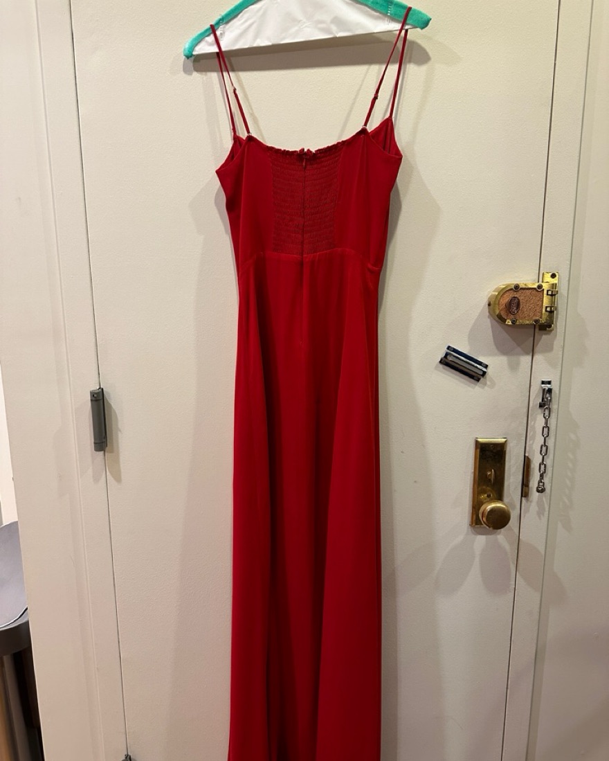 This Reformation dress is perfect for any wedding or special event! It has a side slit and rouching on the back to stretch a bit.
