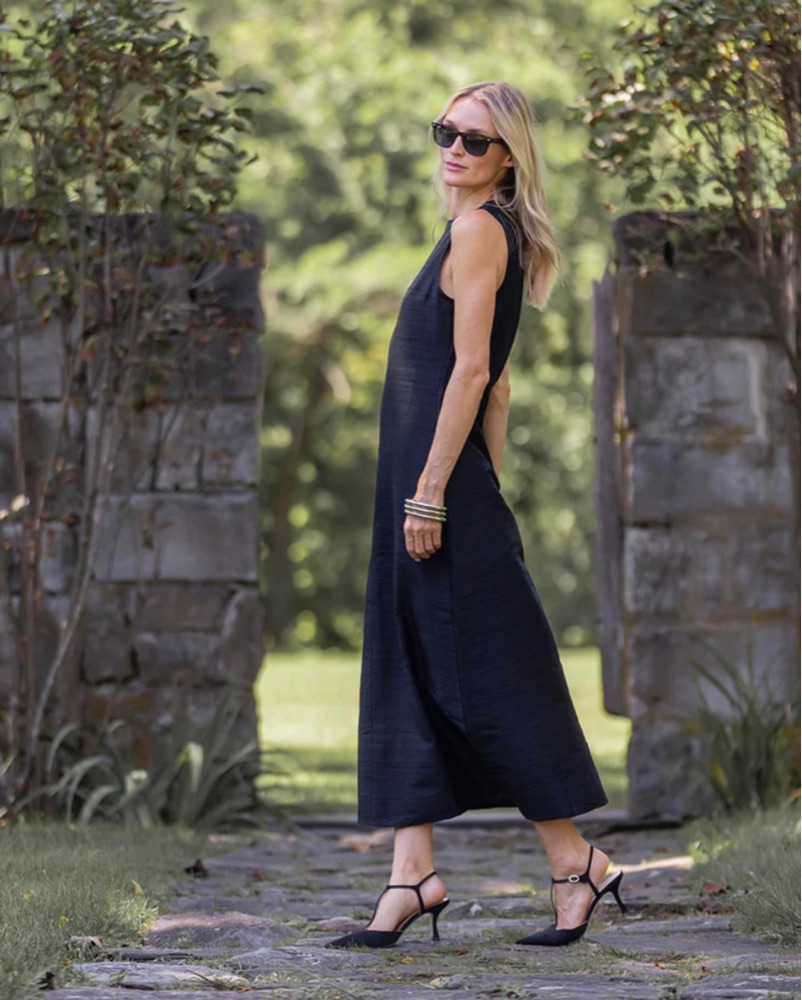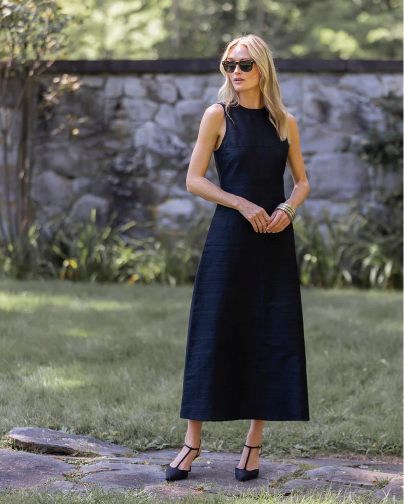 Easy, timeless and the perfect dress to showcase your most treasured accessories, she is a must for every wardrobe. Made with dupioni silk