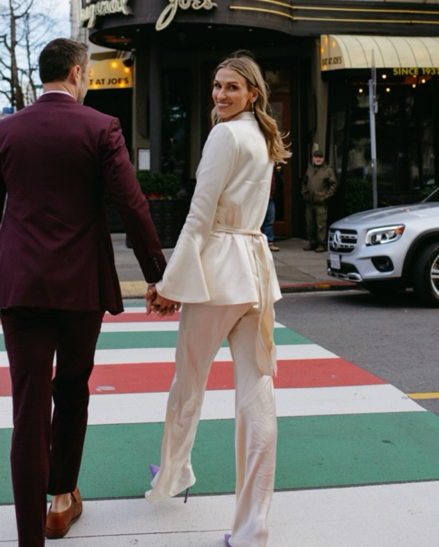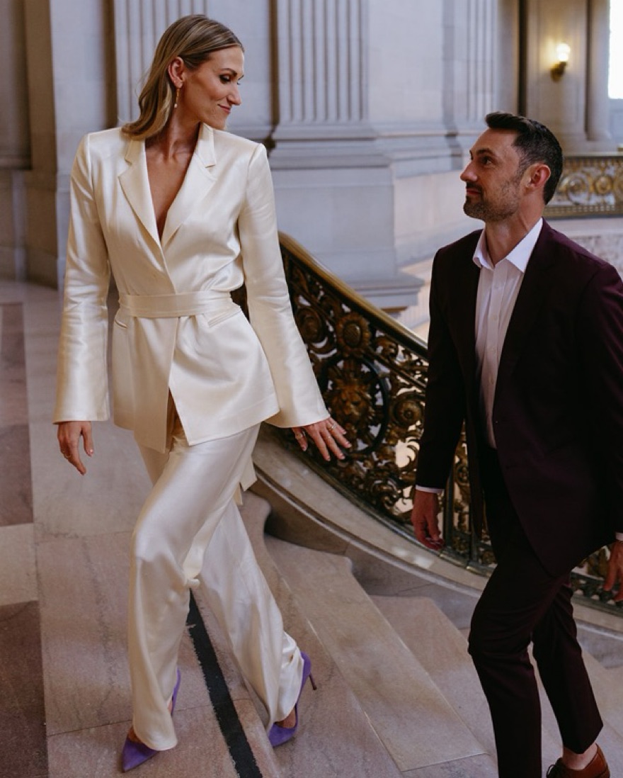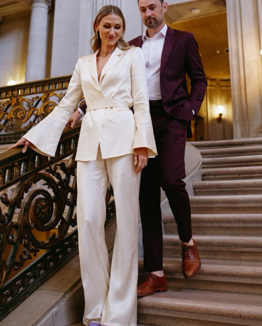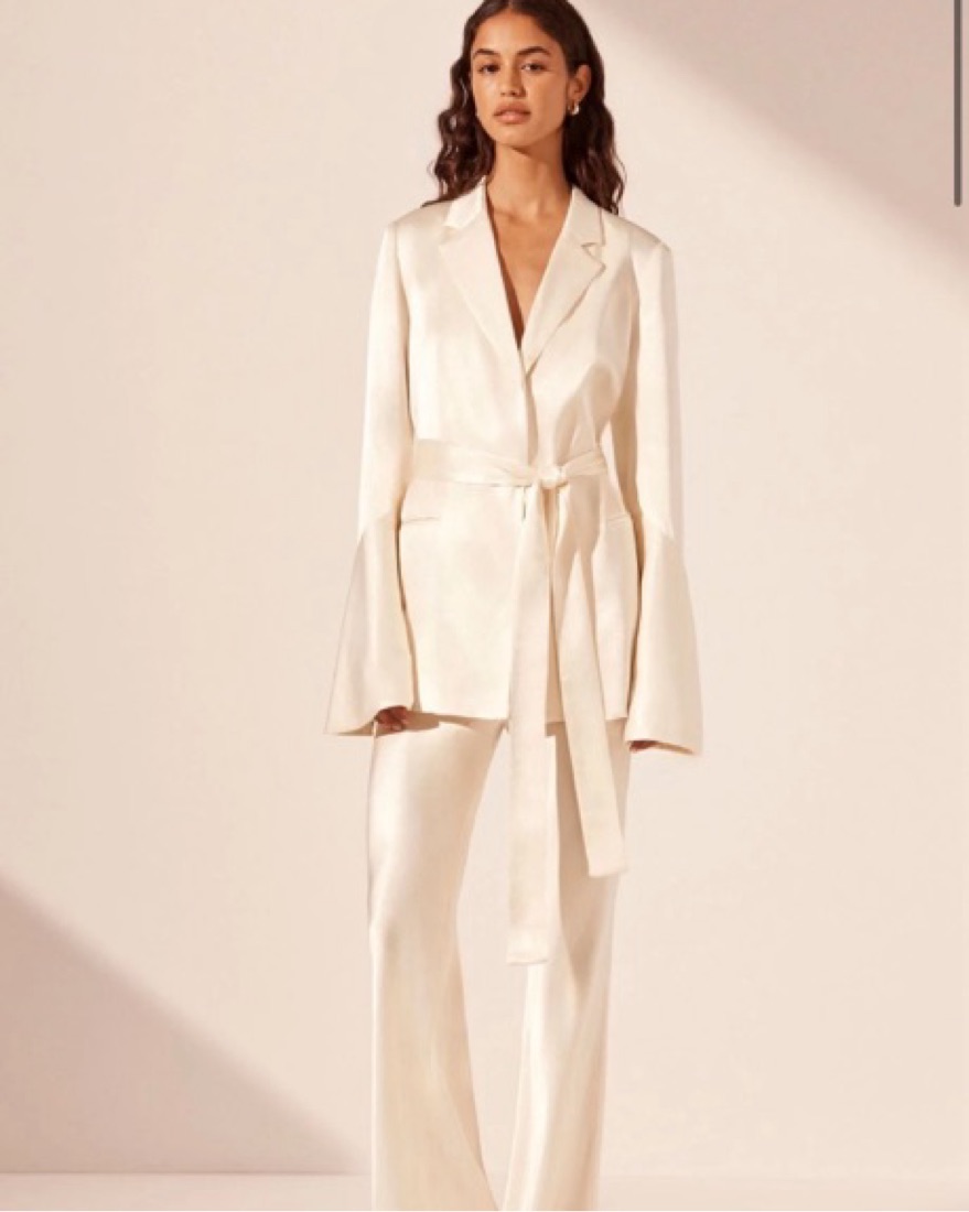 It’s the La Lune Flared Sleeve Belted Blazer and the La Lune Bias Cut Pant both in a size 4 in Cream. Worn once for my civil ceremony.