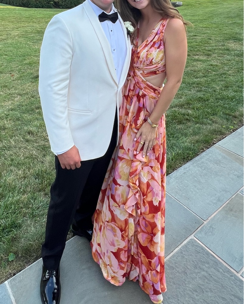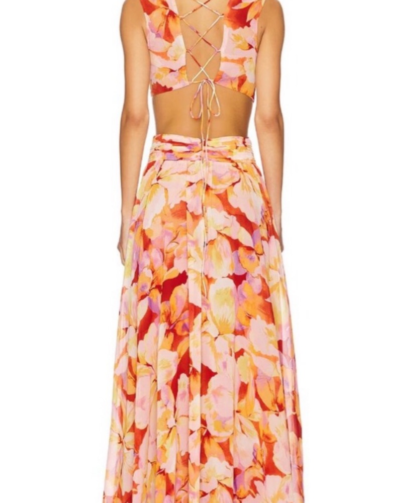This stunning maxi dress is perfect for a summer garden party or outdoor event. The bold floral print and flowing silhouette create a chic and feminine look.