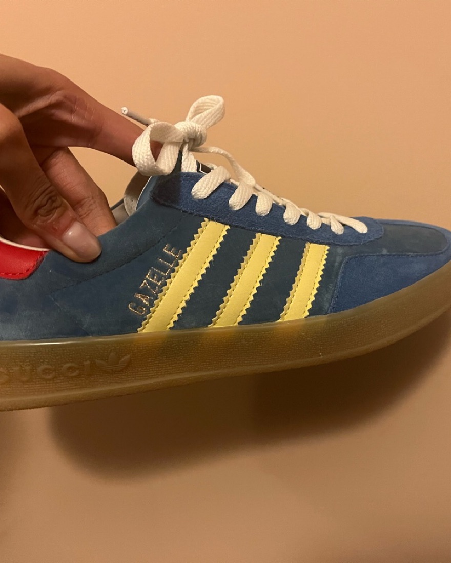 Signature three-stripes are rendered in yellow leather, while a red leather heel tab displays Gucci Trefoil branding.
