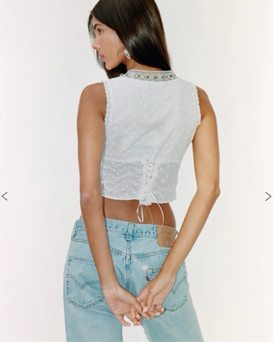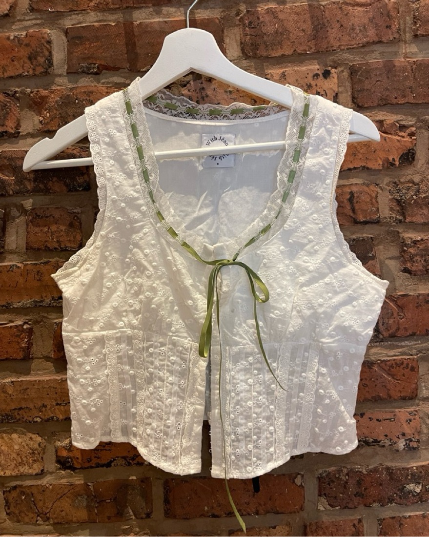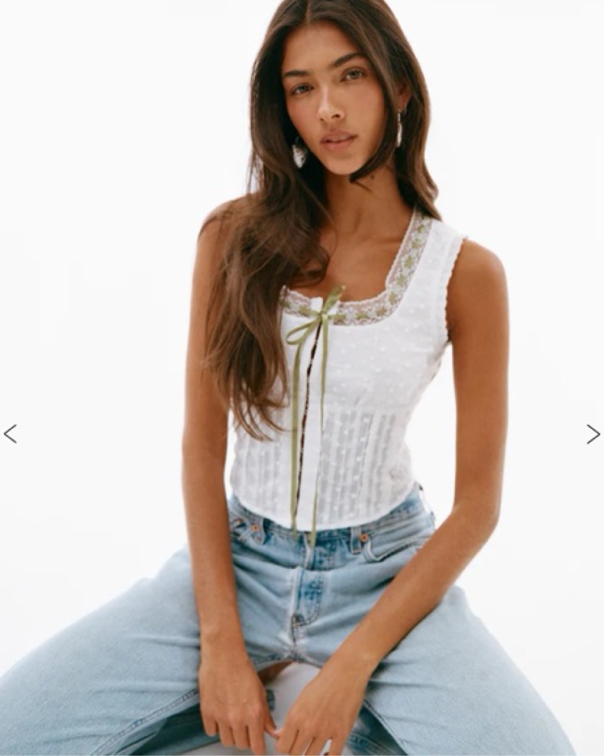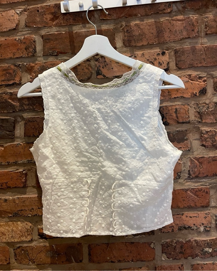 The Adeline Top features a hook and eye front, laced and ribbon detailing, scooped neckline with a self tie corset style back.