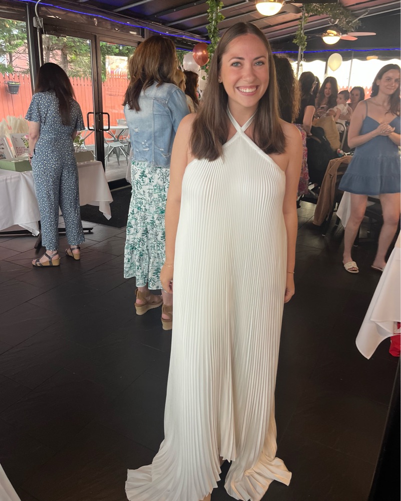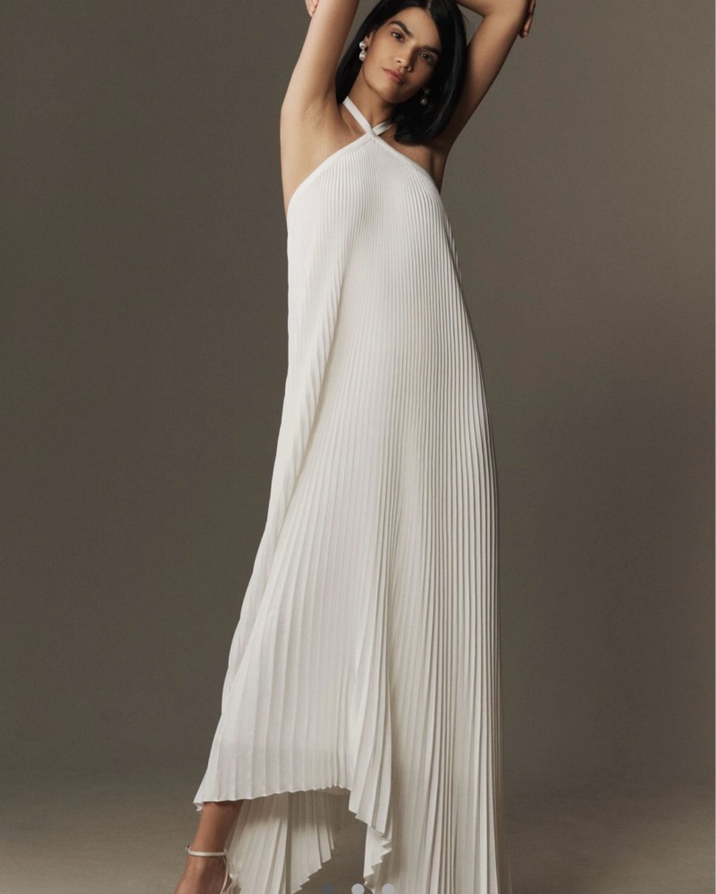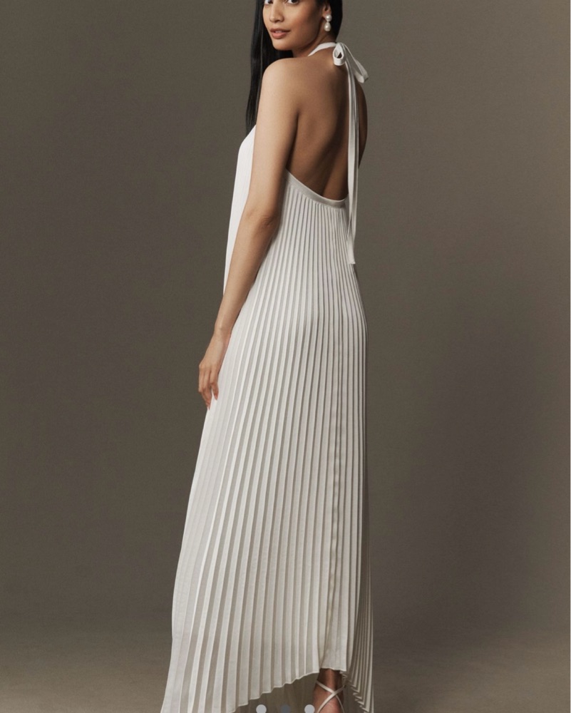 White flowey halter dress with perfect pleats! So cute for a bridal shower, reception, summer event etc.