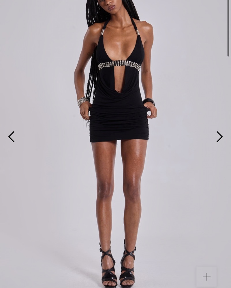 This backless mini dress features a halter silhouette in black stretch jersey with a cut-out drape detail through the front. Silver beaded accents and metal hardware add a striking finish, while a back tie fastening secures the look.