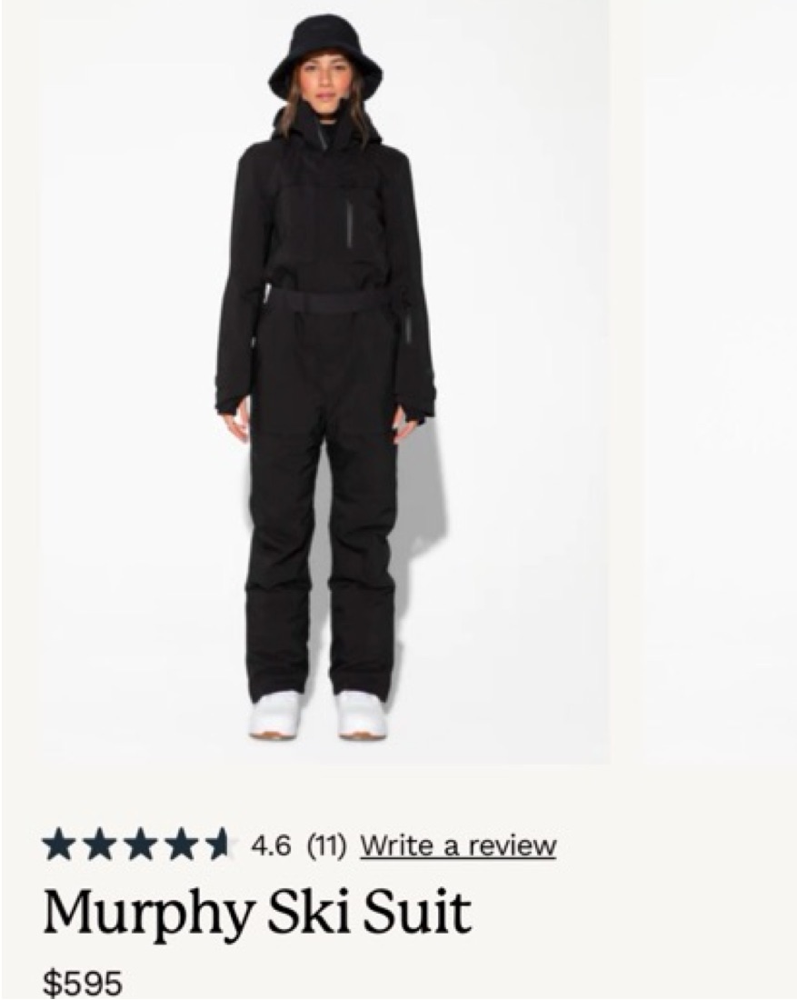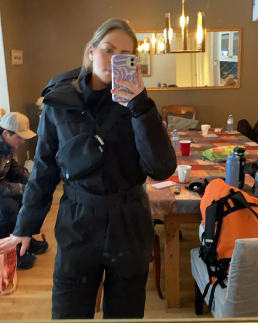 Ski onesie with belt and hood. Really warm and can fit a lot if layers underneath. Worn in Canada in Feb in 15 degrees and stayed warm - hood fits over helmet which keeps you really warm in snowy/windy conditions