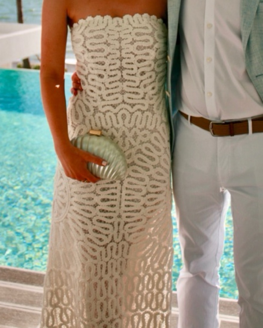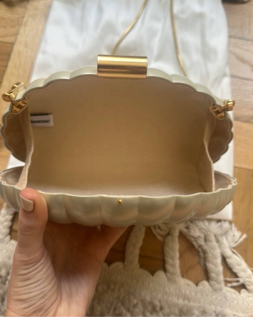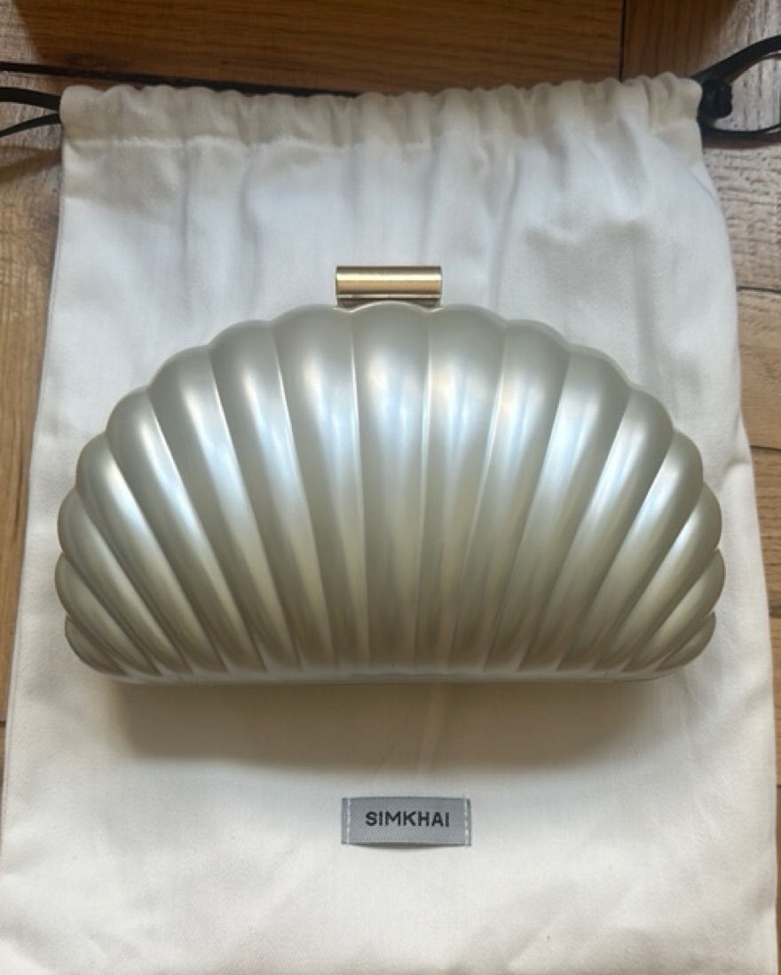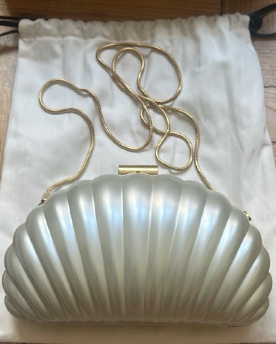 From the brand: “Featuring a chic shell silhouette and a subtle pearlescent finish, it’s the perfect accessory for both day and evening looks.”
