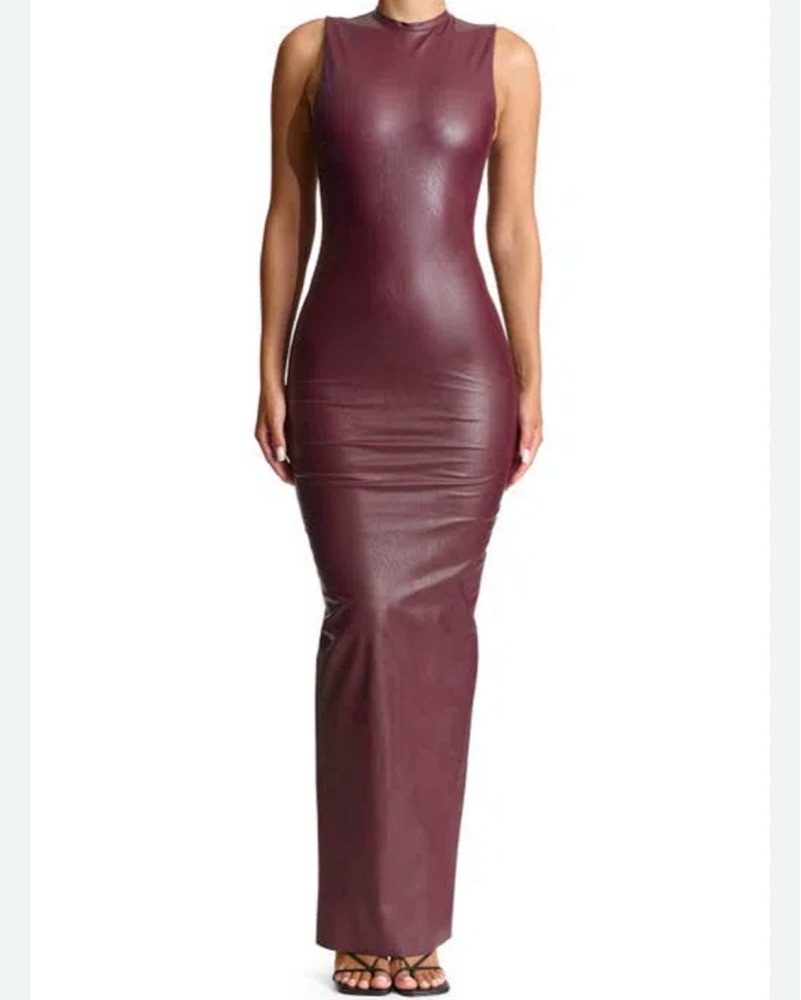 This sleek and alluring burgundy maxi dress is perfect for an elegant evening event. The figure-hugging silhouette and high neckline create a sophisticated look that is sure to turn heads.