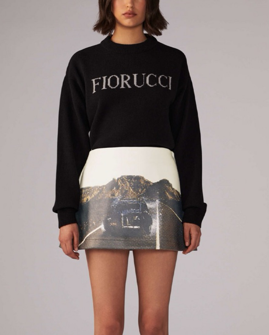 Women’s On the Road Graphic Mini Skirt, featuring the Fiorucci On the Road graphic all over. The printed mini skirt is a flattering a-line shape with a side zip fly, and is crafted from faux leather.