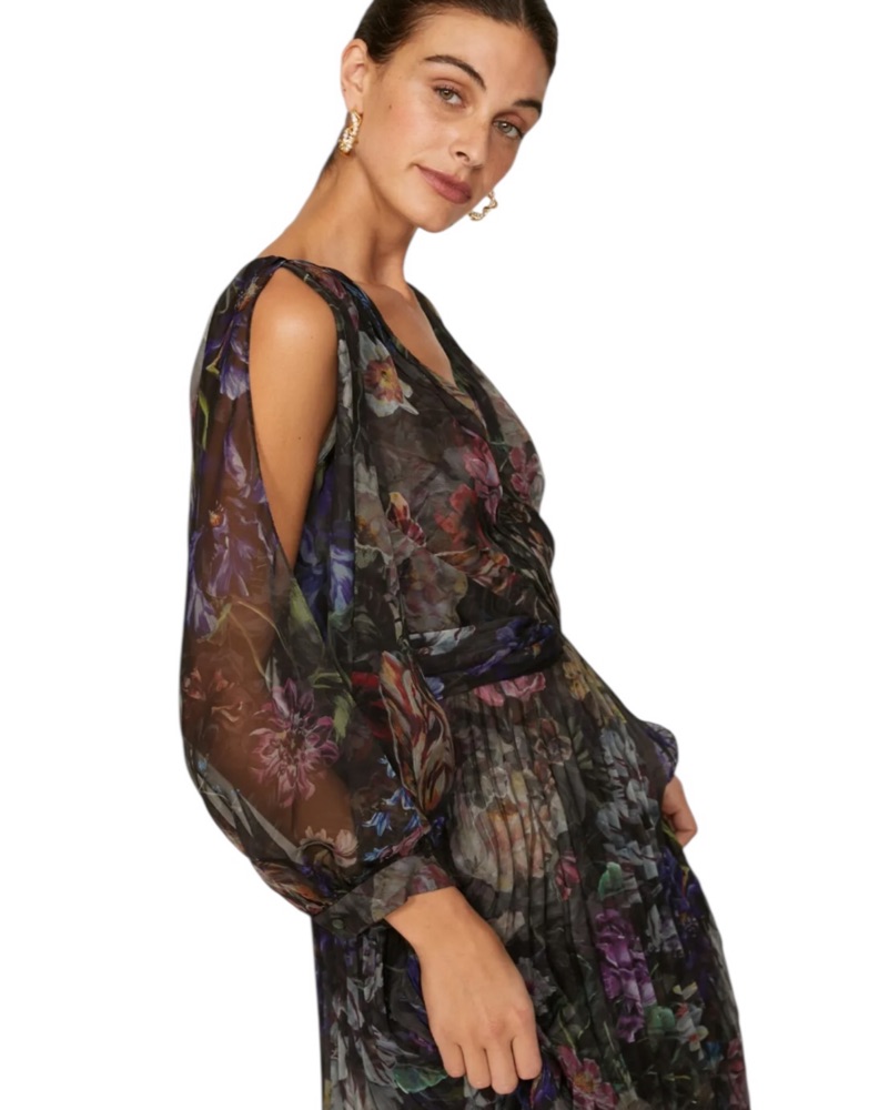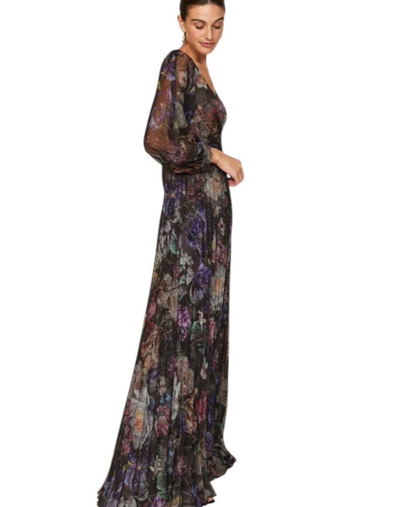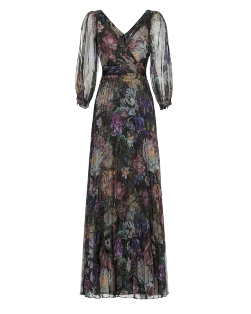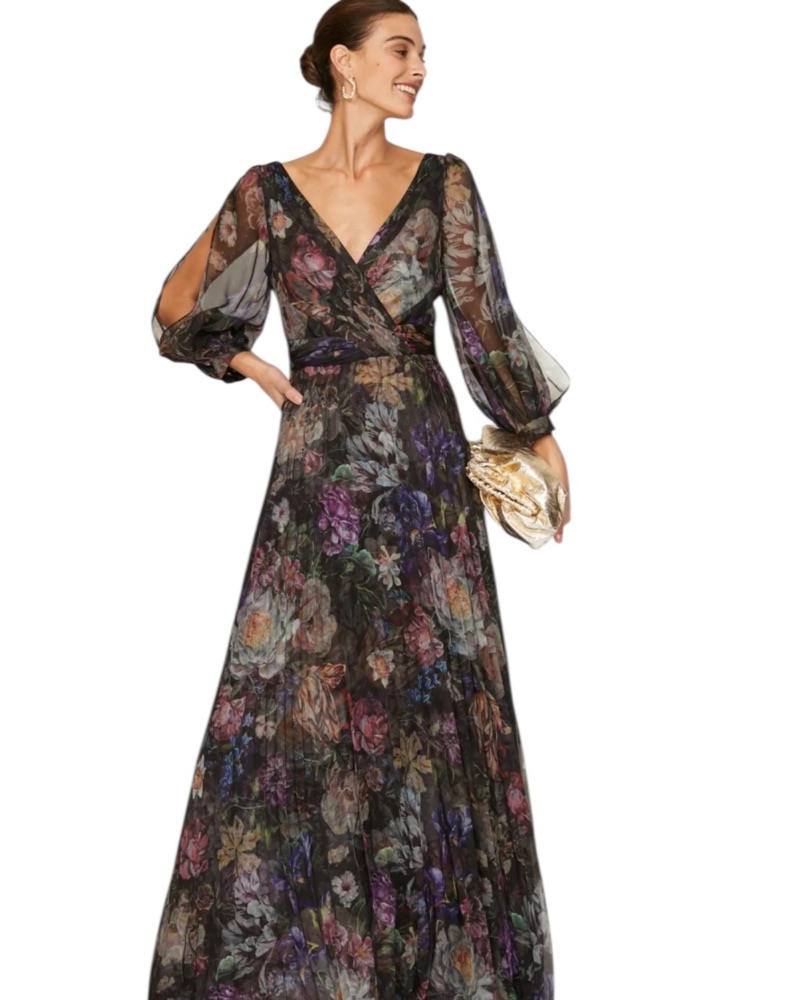 This unabashedly elegant gown by Marchesa Notte stands out in the crowd with metallic florals and whispy statement sleeves.