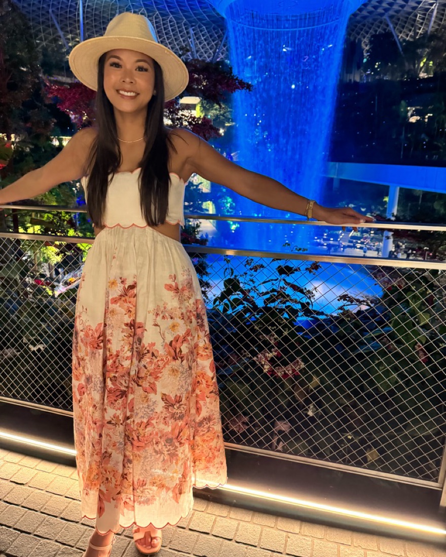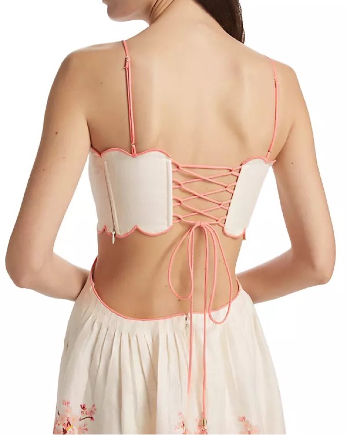 Zimmerman's Devi midi-dress showcases a playful scalloped trim decorated with clean piping. Framed by side cut-outs, this whimsical piece features side-on-seam pockets and an alluring lace-up back.