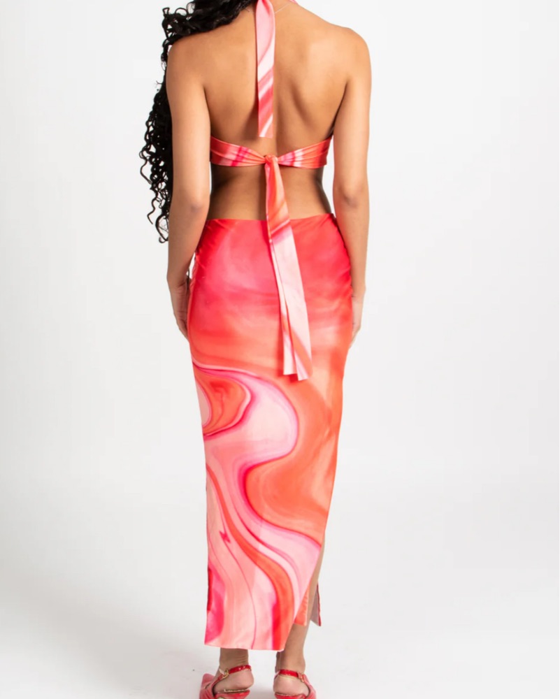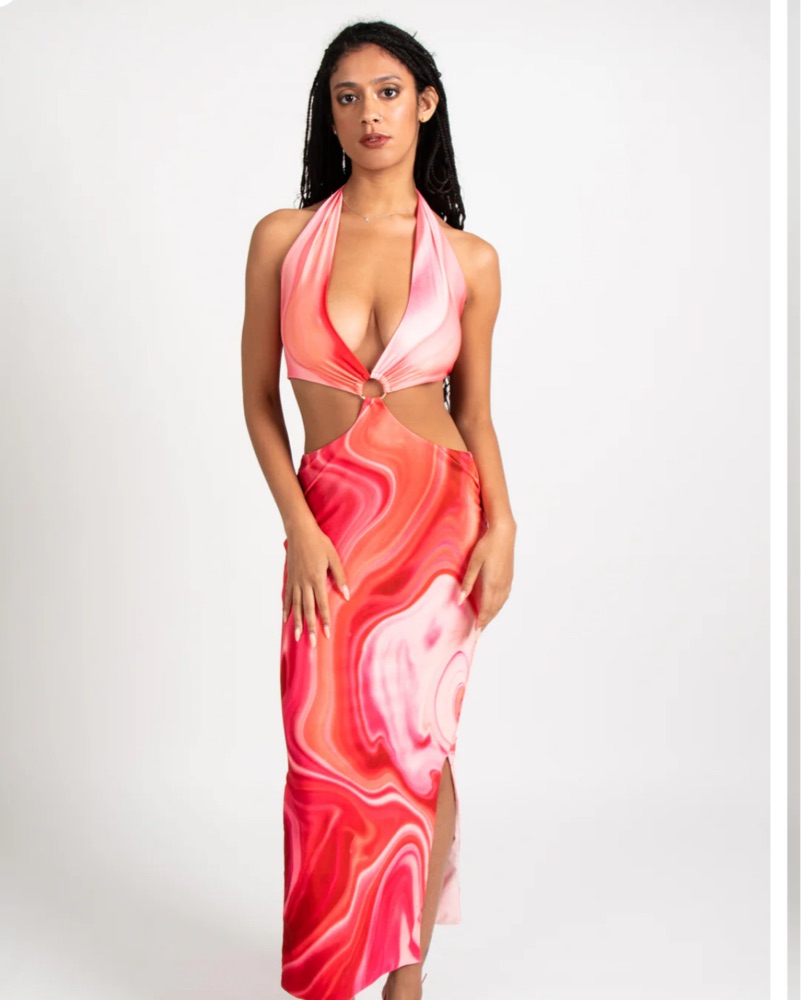 This stunning marbled halter maxi dress is perfect for a glamorous event, beach party, or special occasion. Fits true as a size small