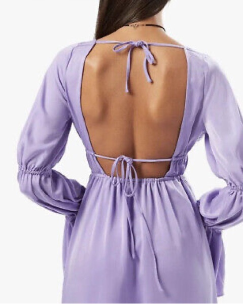 This captivating mini dress features a v-neckline, fitted waist, and puff sleeves that add a feminine, elegant touch. The lavender hue creates a soft, romantic look perfect for any occasion.