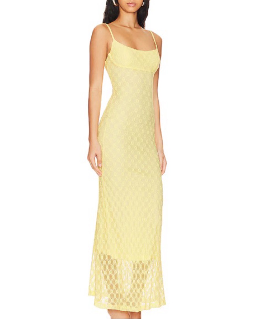 This stunning yellow lace maxi dress is perfect for a special occasion. The intricate lace detailing and figure-flattering silhouette make it a showstopping choice.